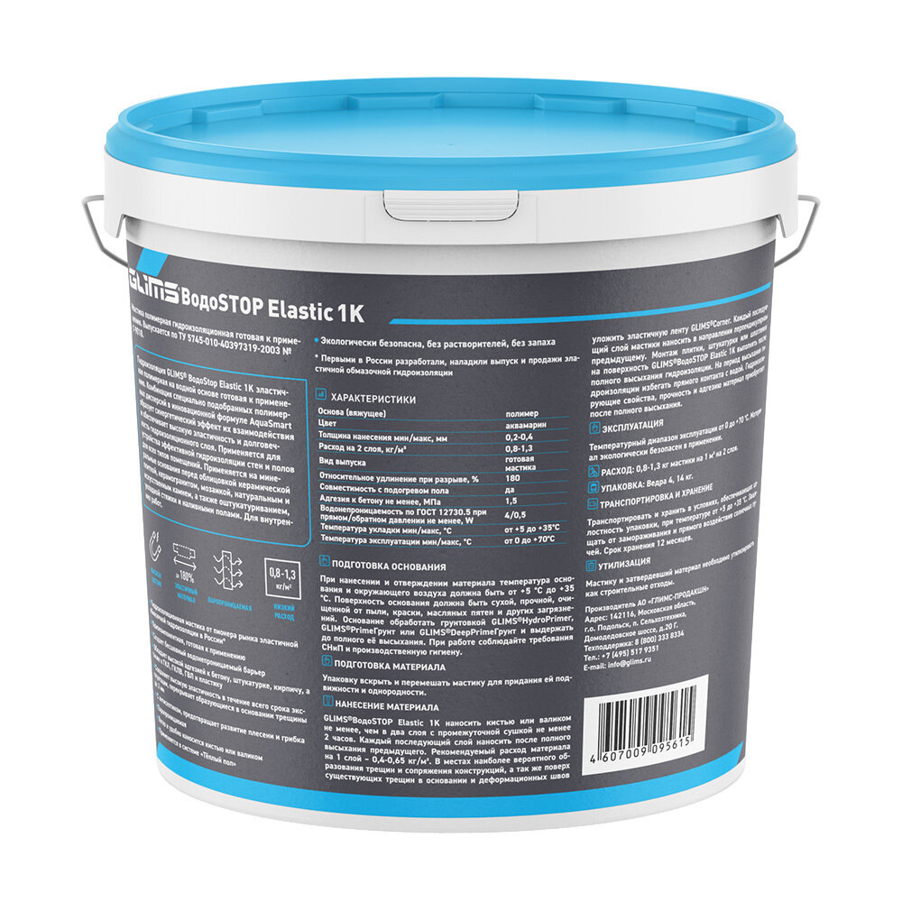 Гидроизоляция акриловая Glims ВодоStop Elastic 1К аквамарин 4 кг интересное: