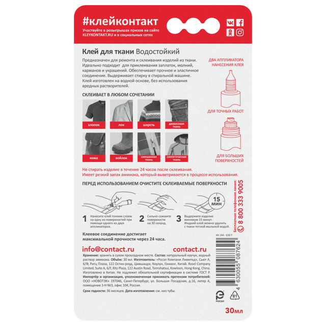 | Дополнительная информация | Клей контактный контакт для ткани 30 мл, арт.24275 |
