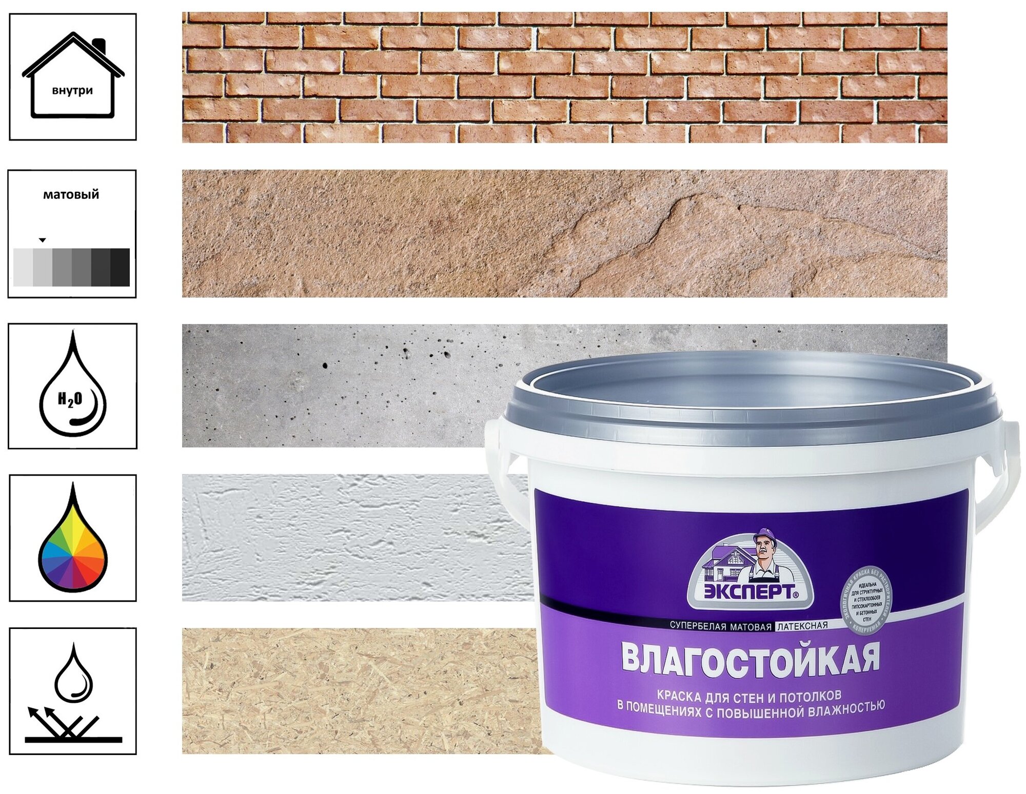 | Дополнительная информация | для окраски стен и потолков внутри сухих и влажных помещений |