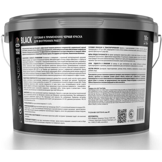 | Дополнительная информация | Краска в/д DUFA Trend Farbe Black для стен и потолков 10л черная, арт. МП00-005871 |