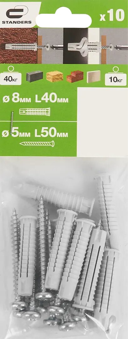 | Дополнительная информация | Дюбель универсальный Standers, 8x40 мм, нейлон, 10 шт. |