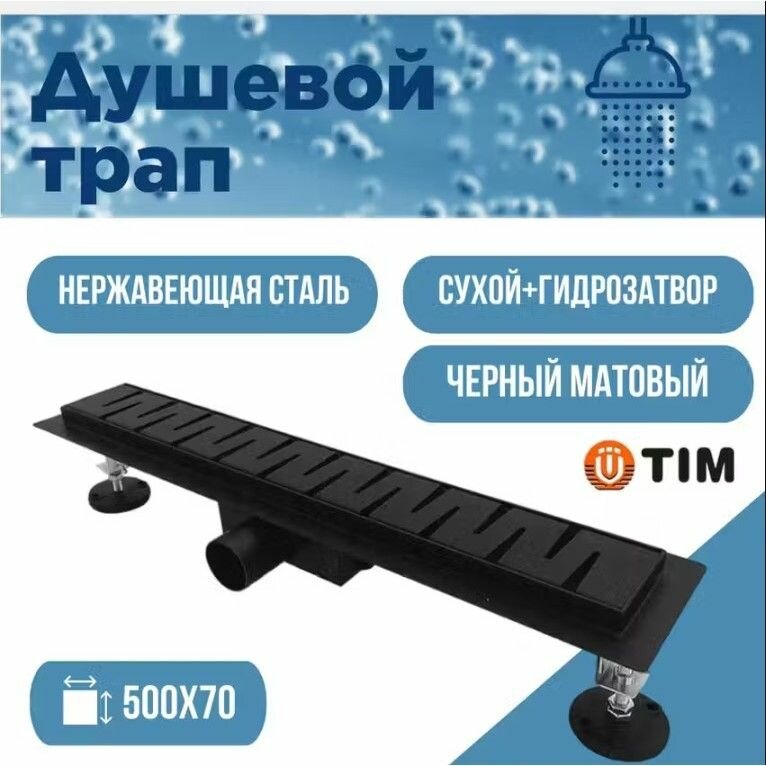 Душевой лоток из нержавеющей стали, решетка черная матовая 70х500мм (сухой +гидрозатвор) TIM BAD465002BK