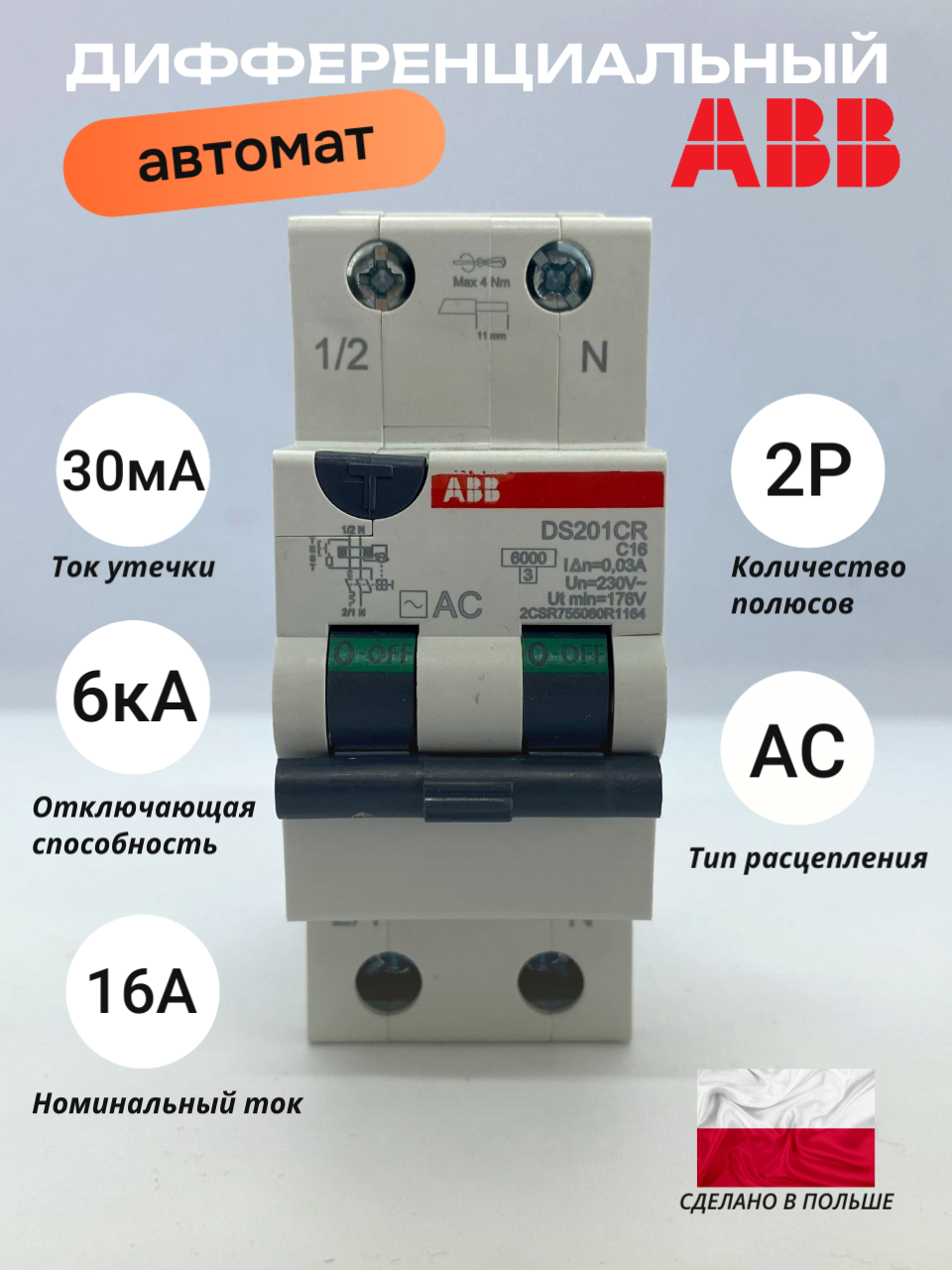 Дифавтомат АВВ DS201CR 16A 30мА 6кА 2CSR755080R1164 интересное: