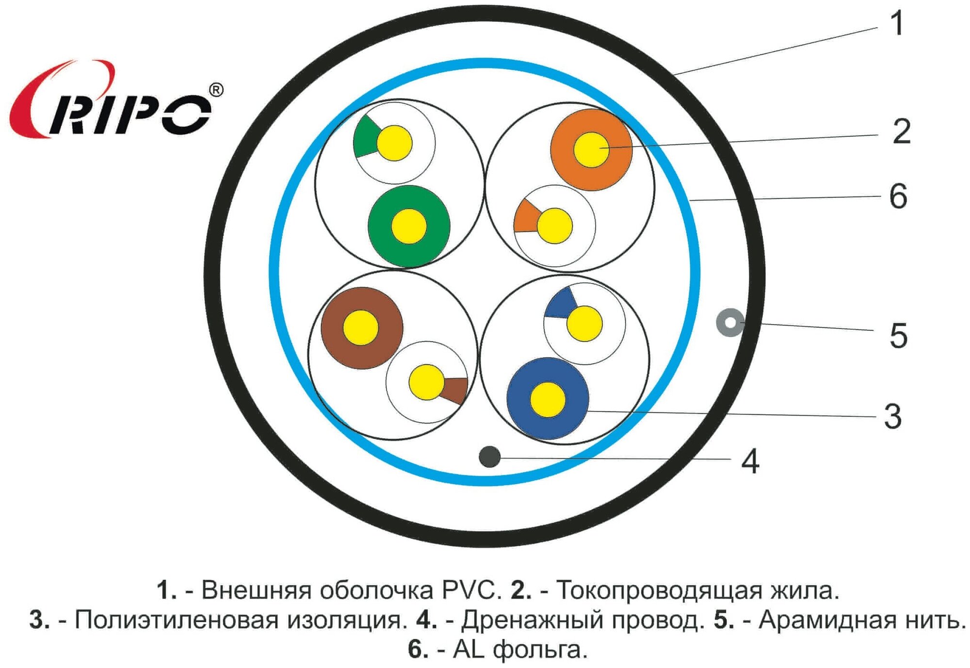 Кабель витая пара для локальной сети LAN FTP4 CAT5E 24AWG Cu PE RIPO outdoor уличный 25 метров 001-122014/25
