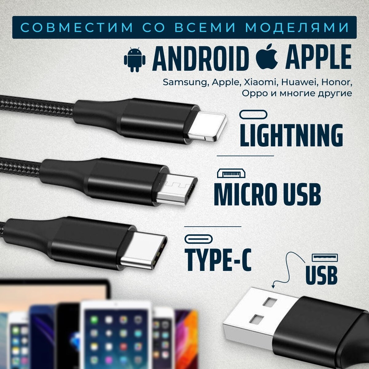 Купить Кабель для зарядки телефона 3 в 1 с разъемами Lightning, Type C, micro USB, быстрая зарядка для смартфонов 1,2 м черный