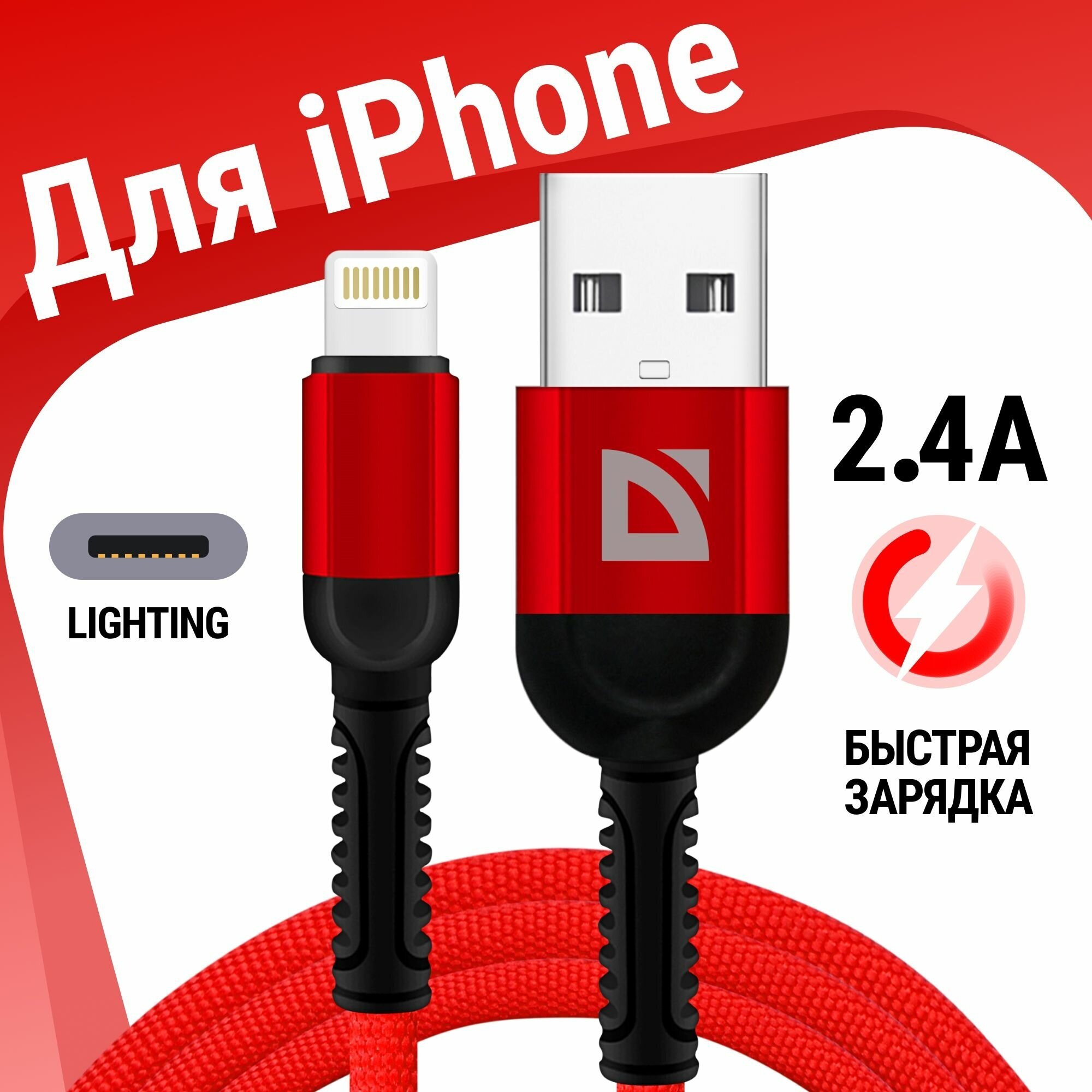 Купить USB кабель Defender F167 Lightning красный, 1м, 2.4А, ткань, пакет