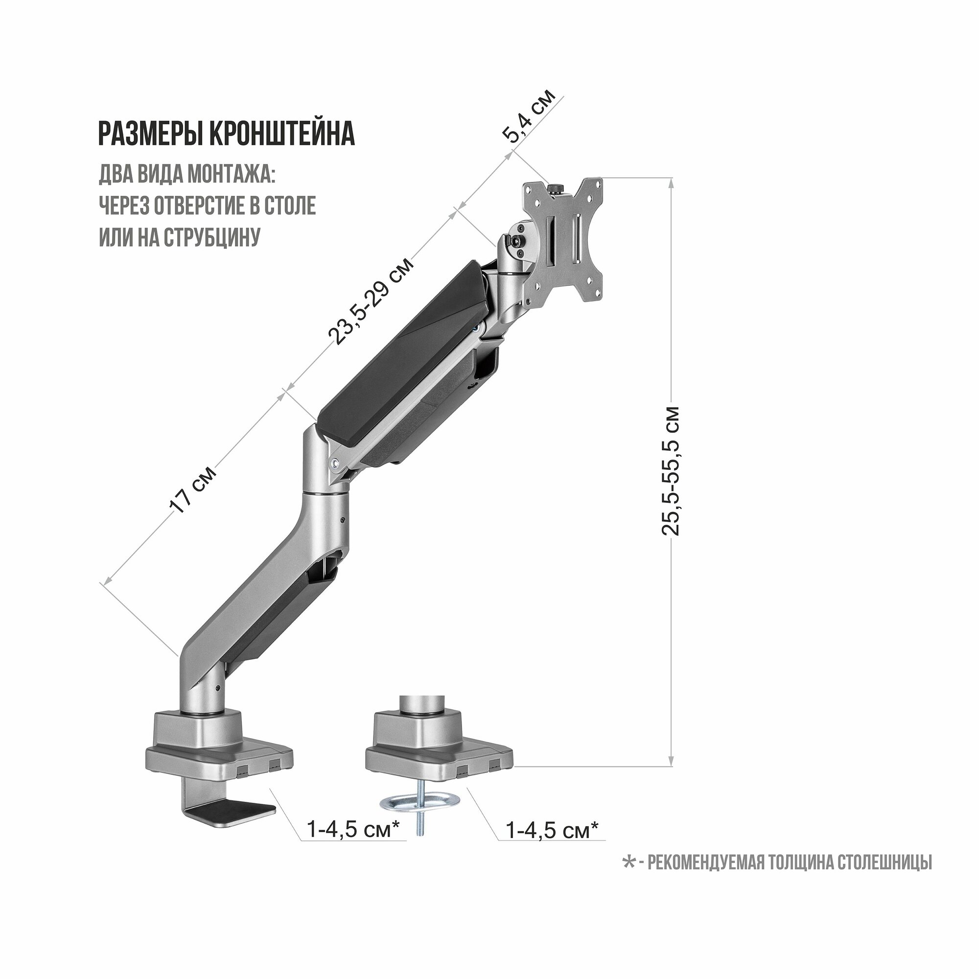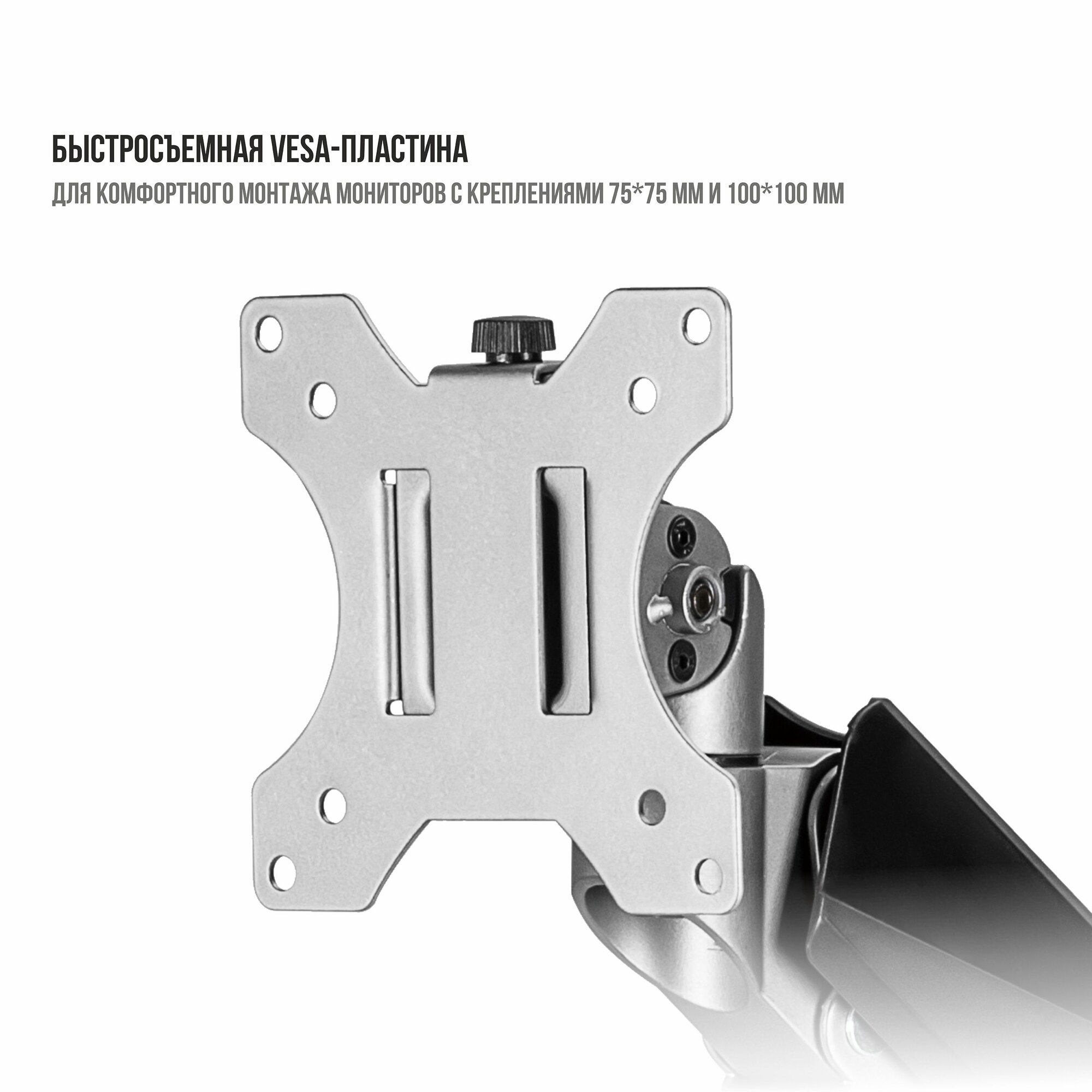| Комплектация | - Кронштейн для монитора - VESA-пластина - Крепление к столу (струбцина) - Крепление к столу (через отверстие в столе, рекомендуемый диаметр отверстия 10-60 мм) - Набор ключей для монтажа с креплением на ножке кронштейна |