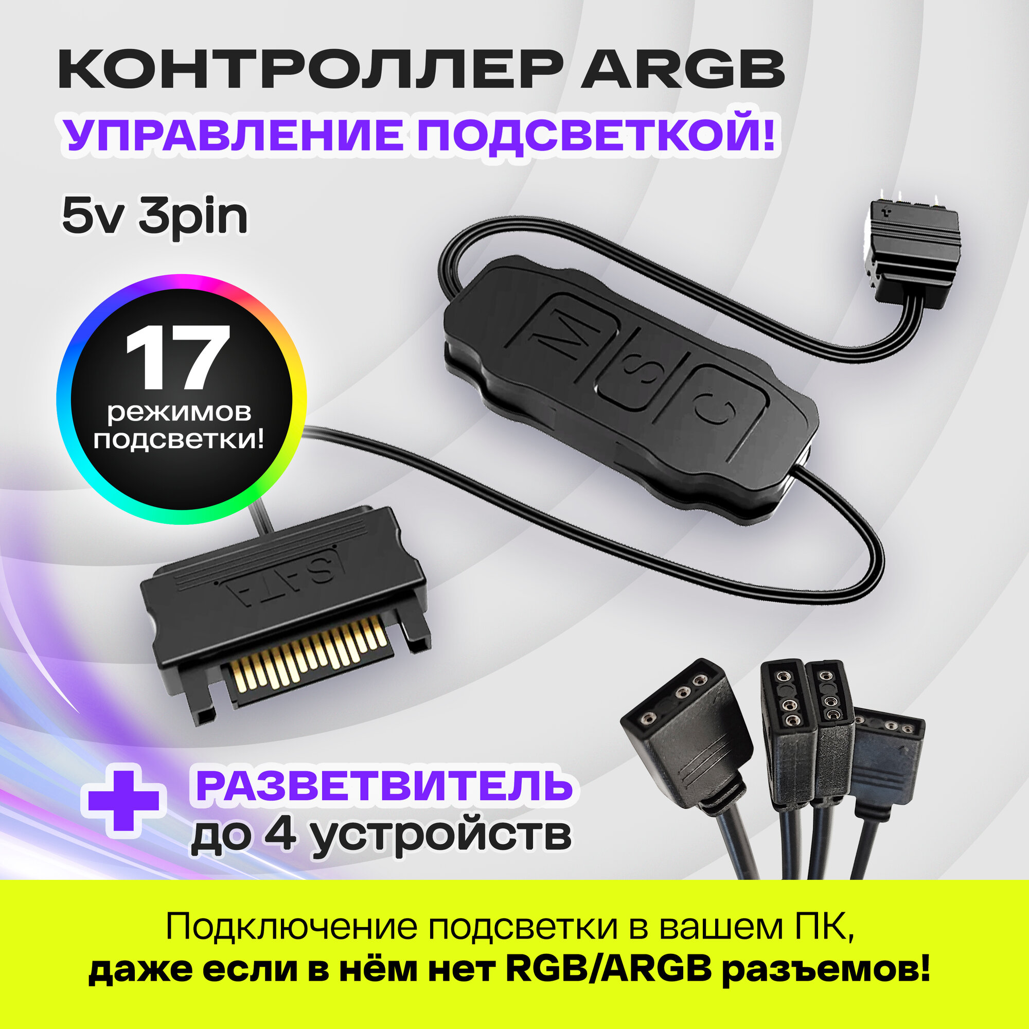Контроллер ARGB для ПК. COOLMOON контроллер для вентиляторов с подсветкой 5v 3pin ARGB, питание SATA, белый + разветвитель на 4 выхода