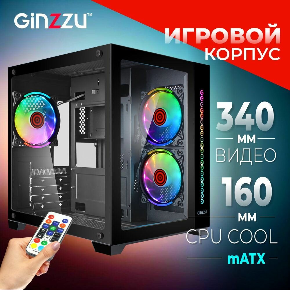 Корпус Ginzzu V450 mATX кубик RGB, закаленное стекло, вентиляторы 3*12CM RGB, Controller CRC06+ пульт ДУ