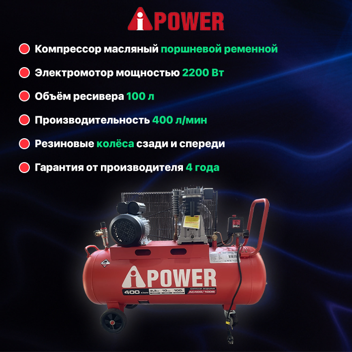 Компрессор поршневой масляный ременной A-iPower AC400/100B (10 Бар, 400 л/мин, 2200 Вт, 100 л, 72 кг) интересное: