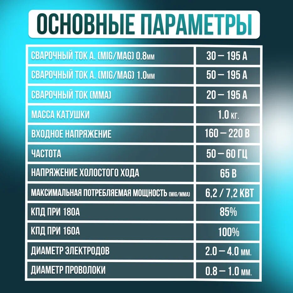 | Сварочный ток (MIG/MAG) | 30-195 А |
