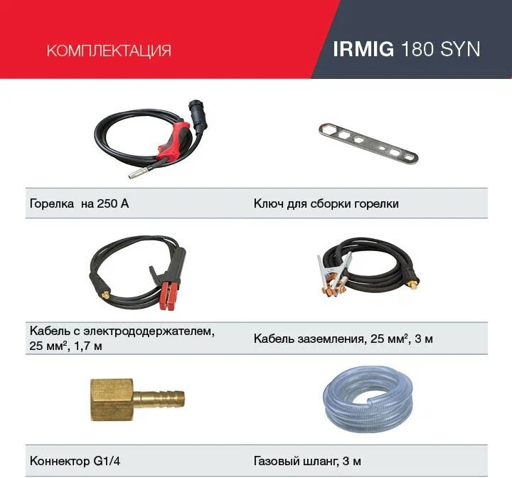 | Комплектация | Горелка FB 250 3м, Кабель заземления 3м медь, Кабель с электрододержателем 1,5 м, Газовый шланг 3м. |