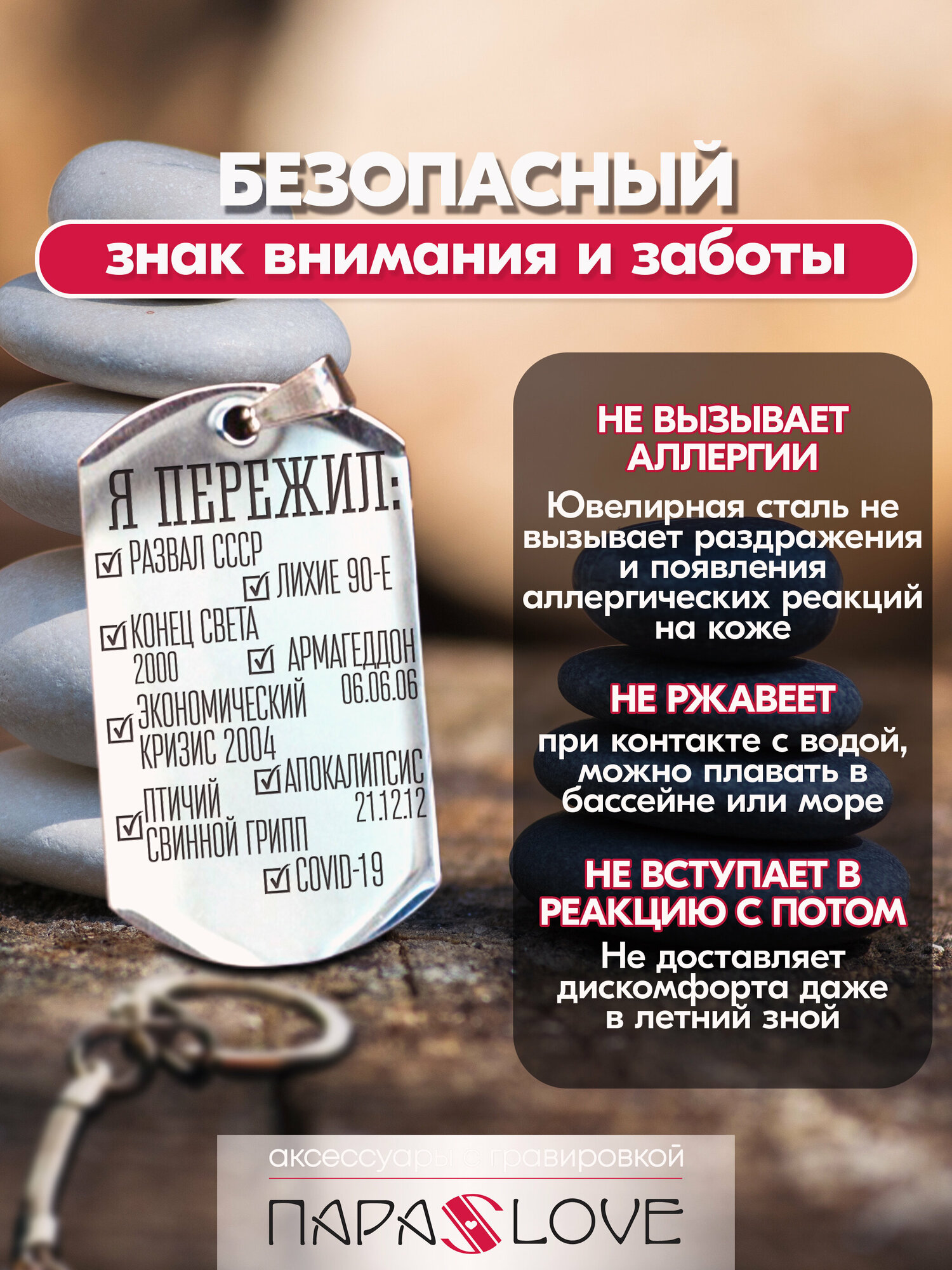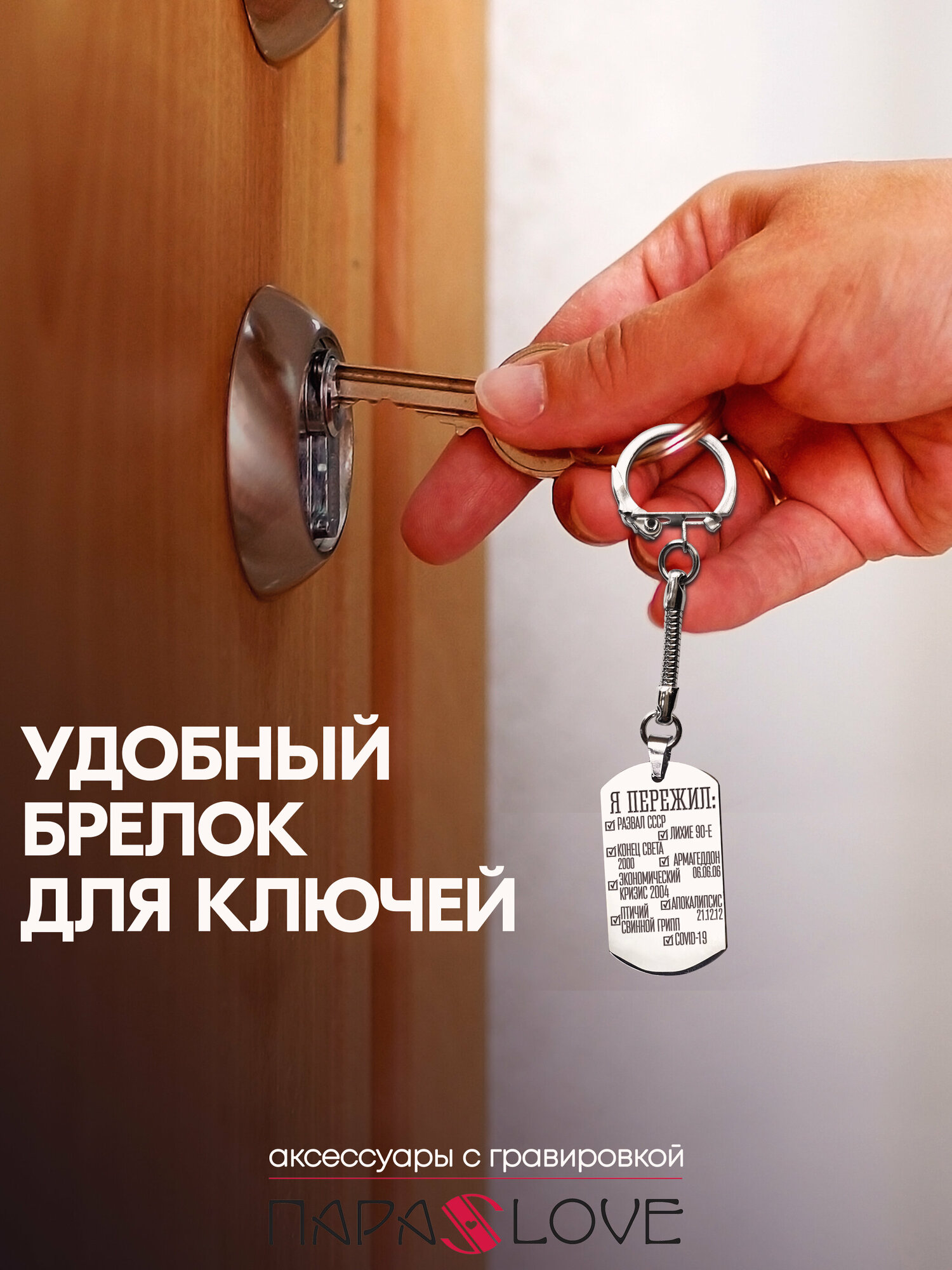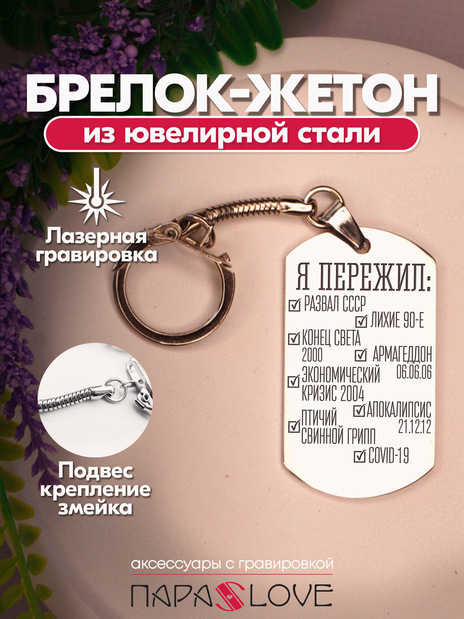 Брелок для ключей "Я пережил..." с лазерной гравировкой в подарочной коробке. Жетон на сумку, рюкзак, ключи авто и дома интересное: