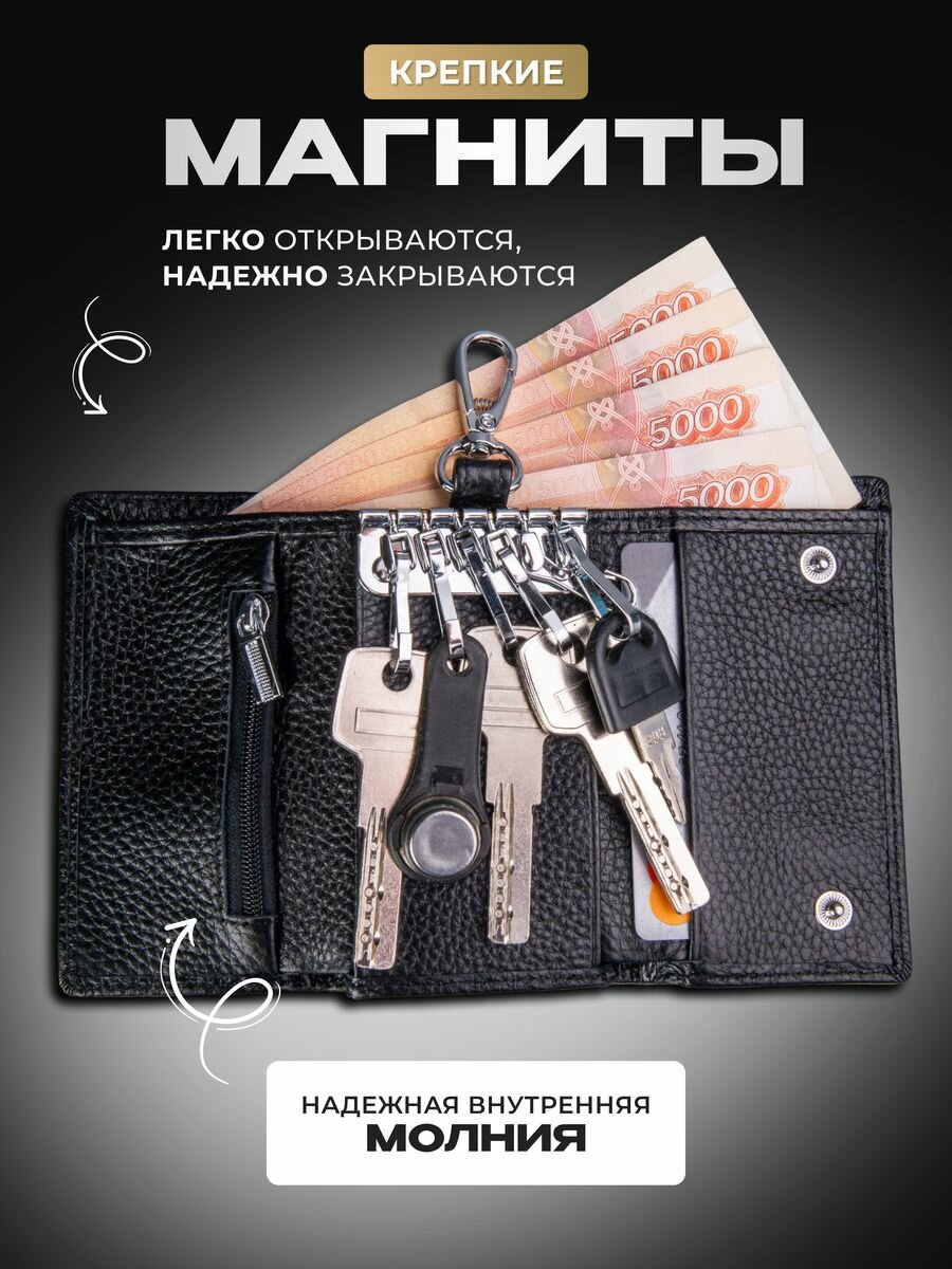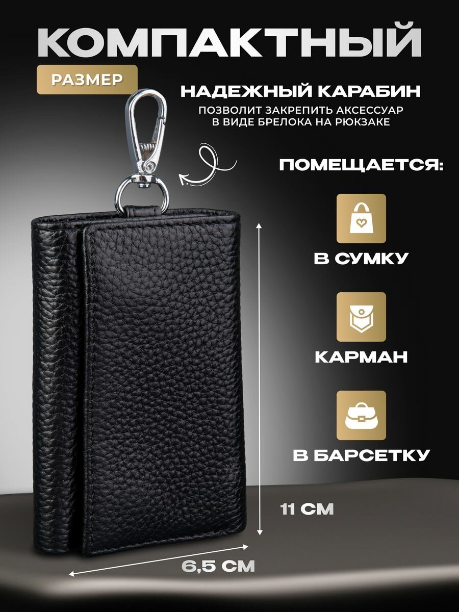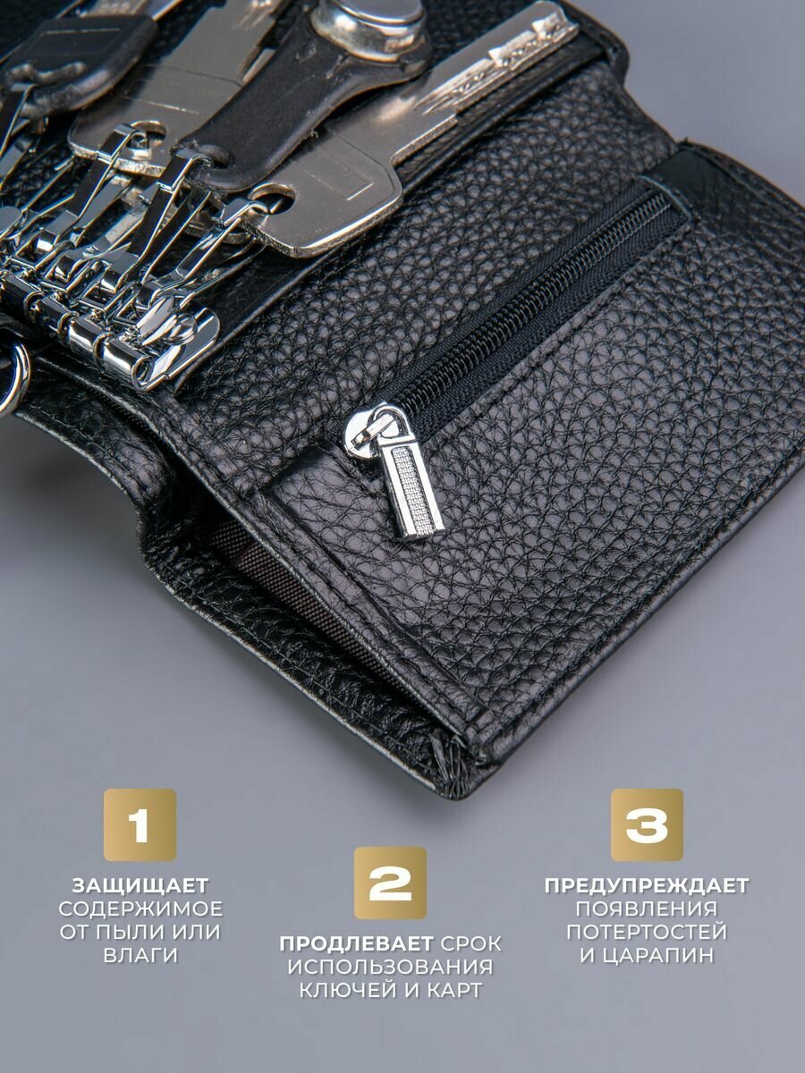 Ключница из натуральной кожи, 2 отделения на молнии, карабин, черный