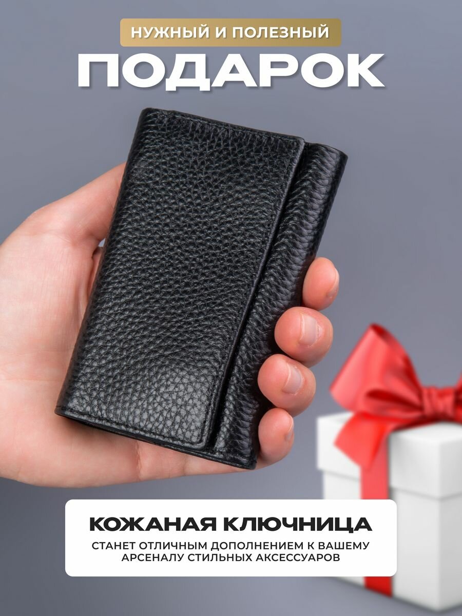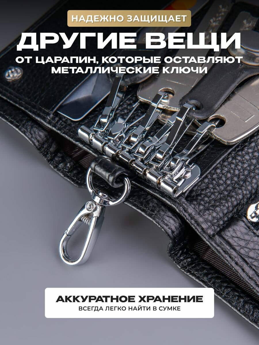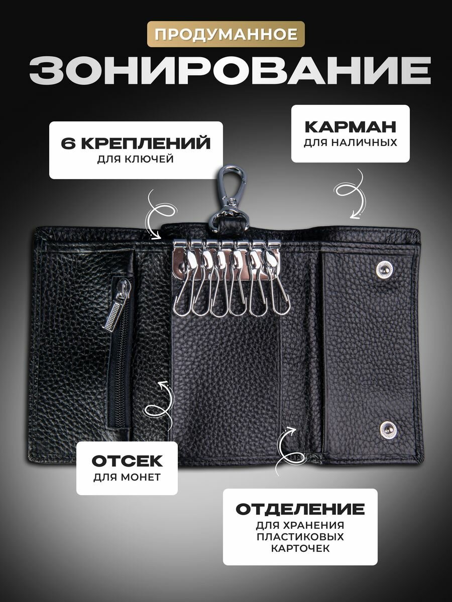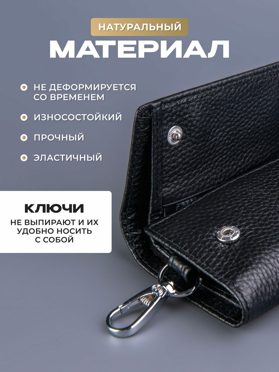 Ключница из натуральной кожи, 2 отделения на молнии, карабин, черный