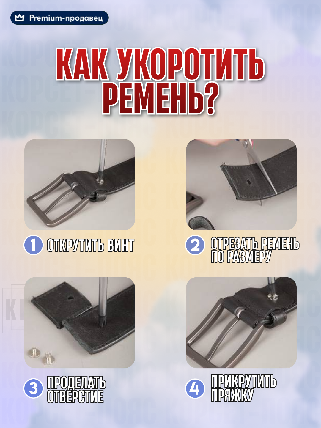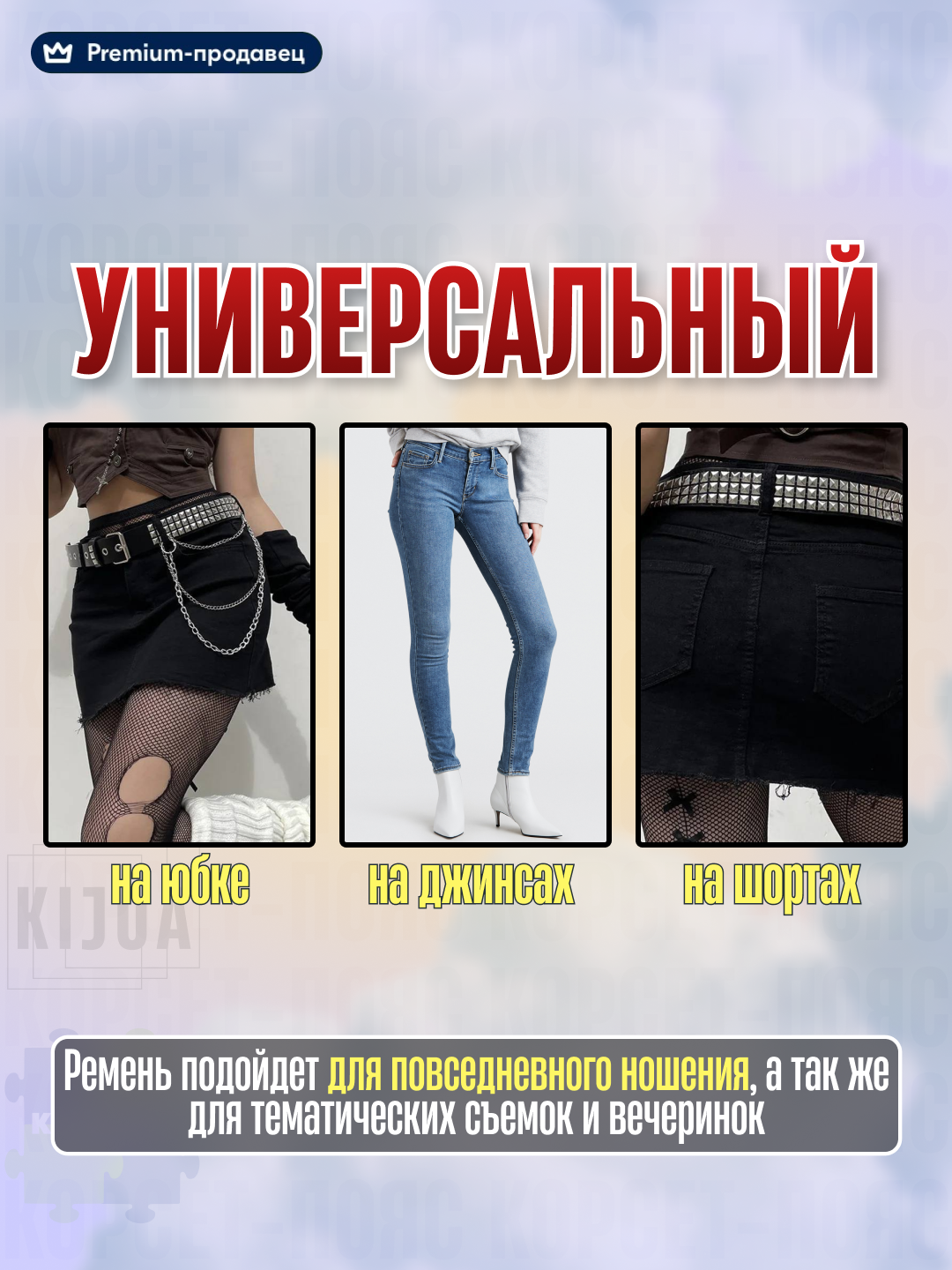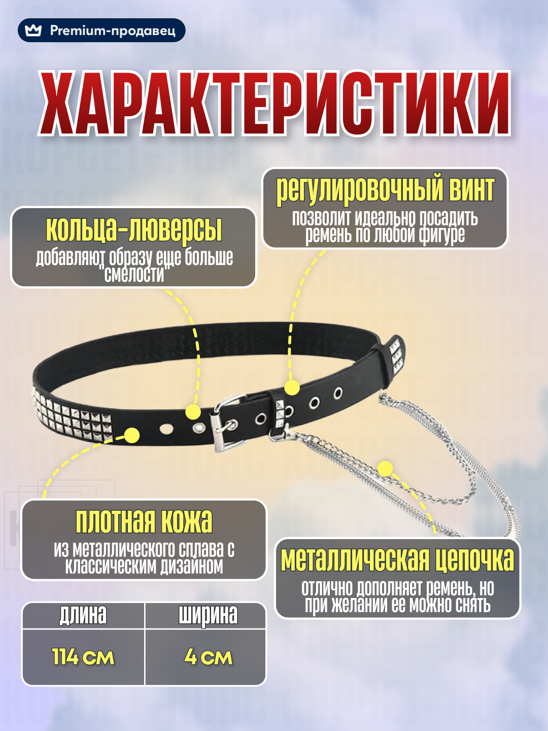 | Комплектация | Ремень с клепками и цепью; индивидуальная упаковка |