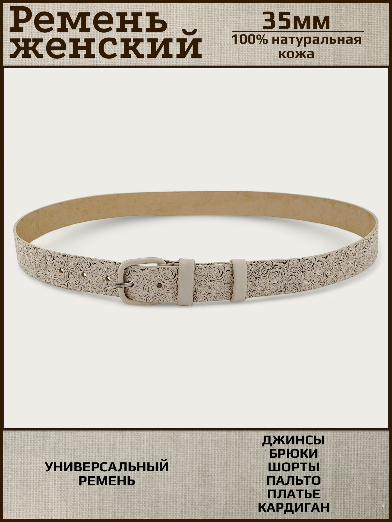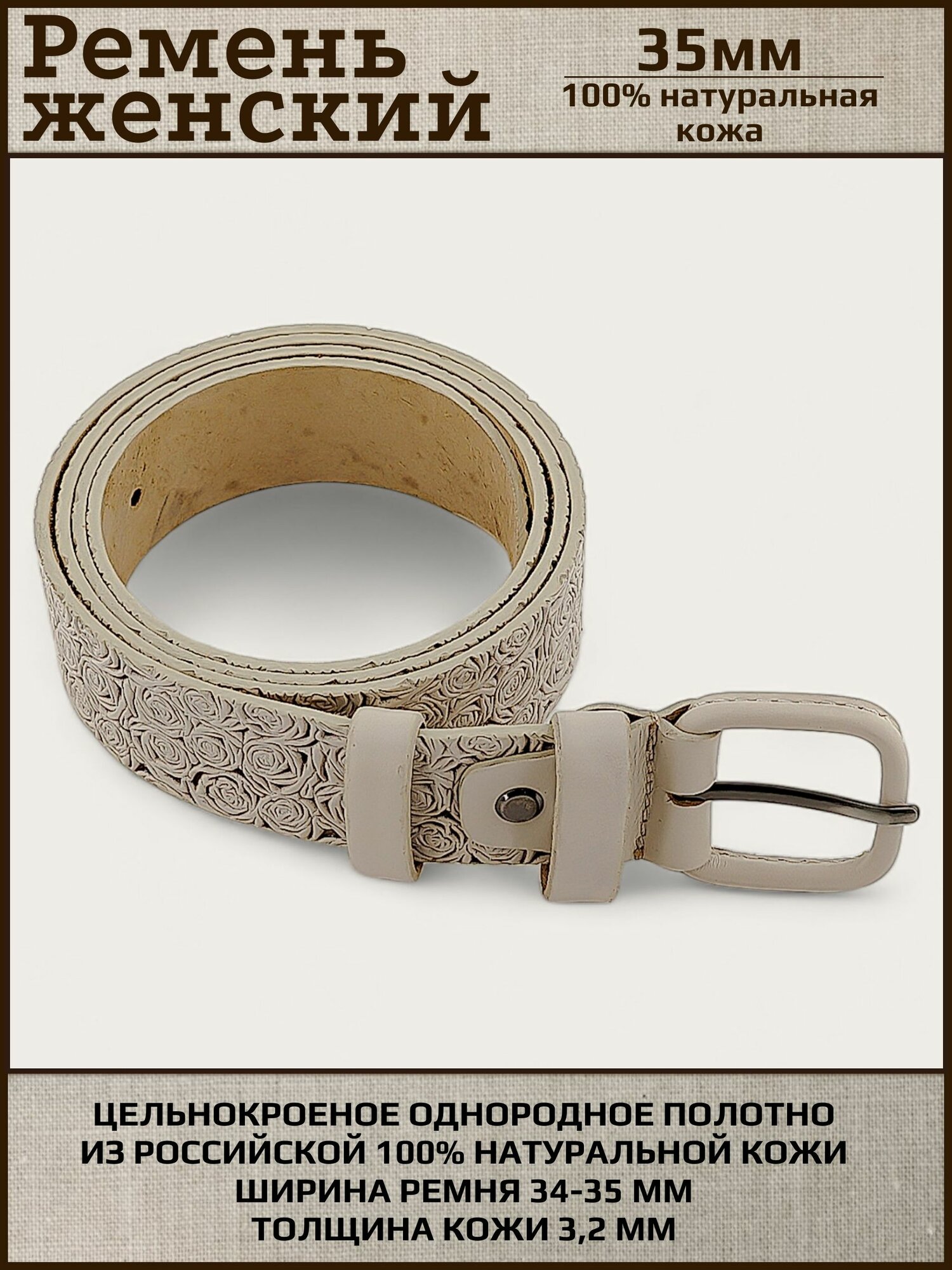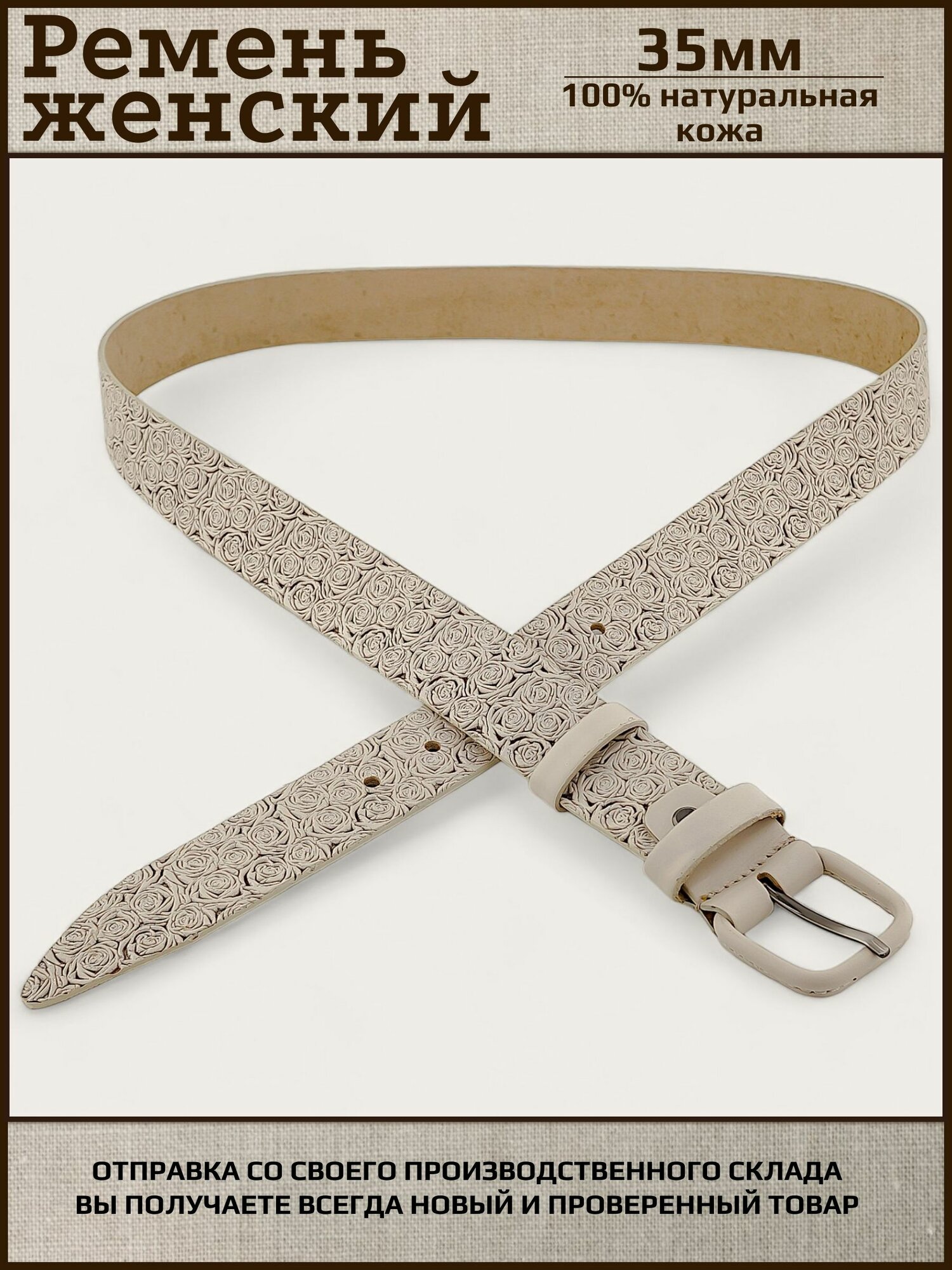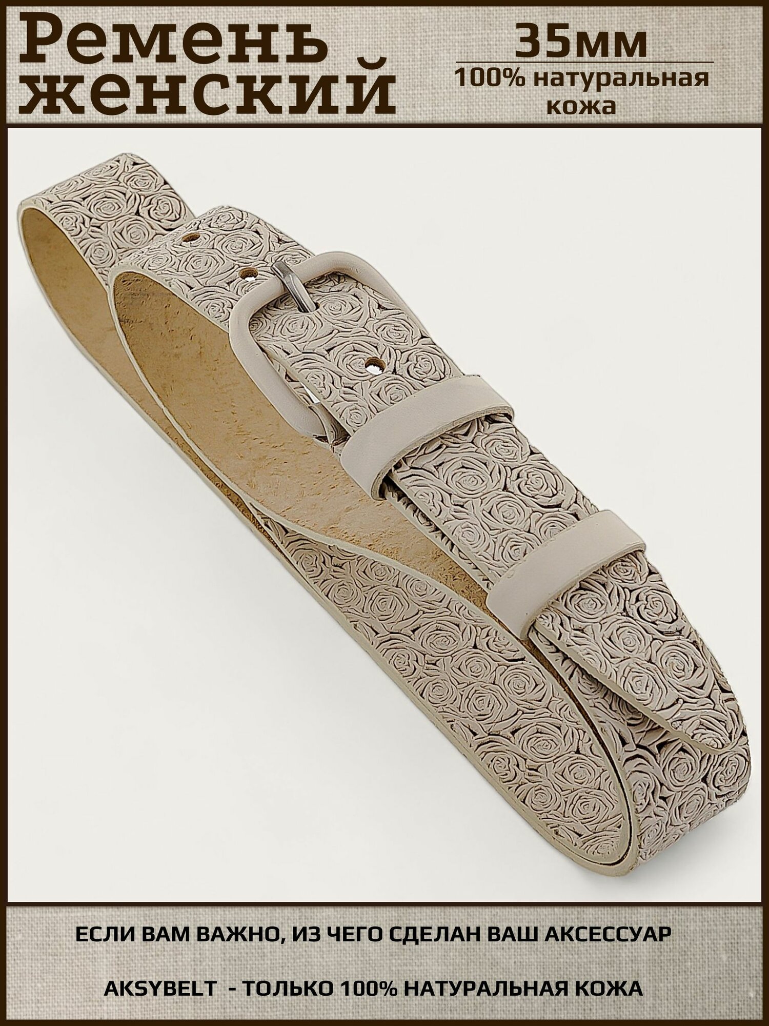Ремень женский натуральная кожа AKSY BELT, бежевый, роза, кожаная пряжка, 110 см