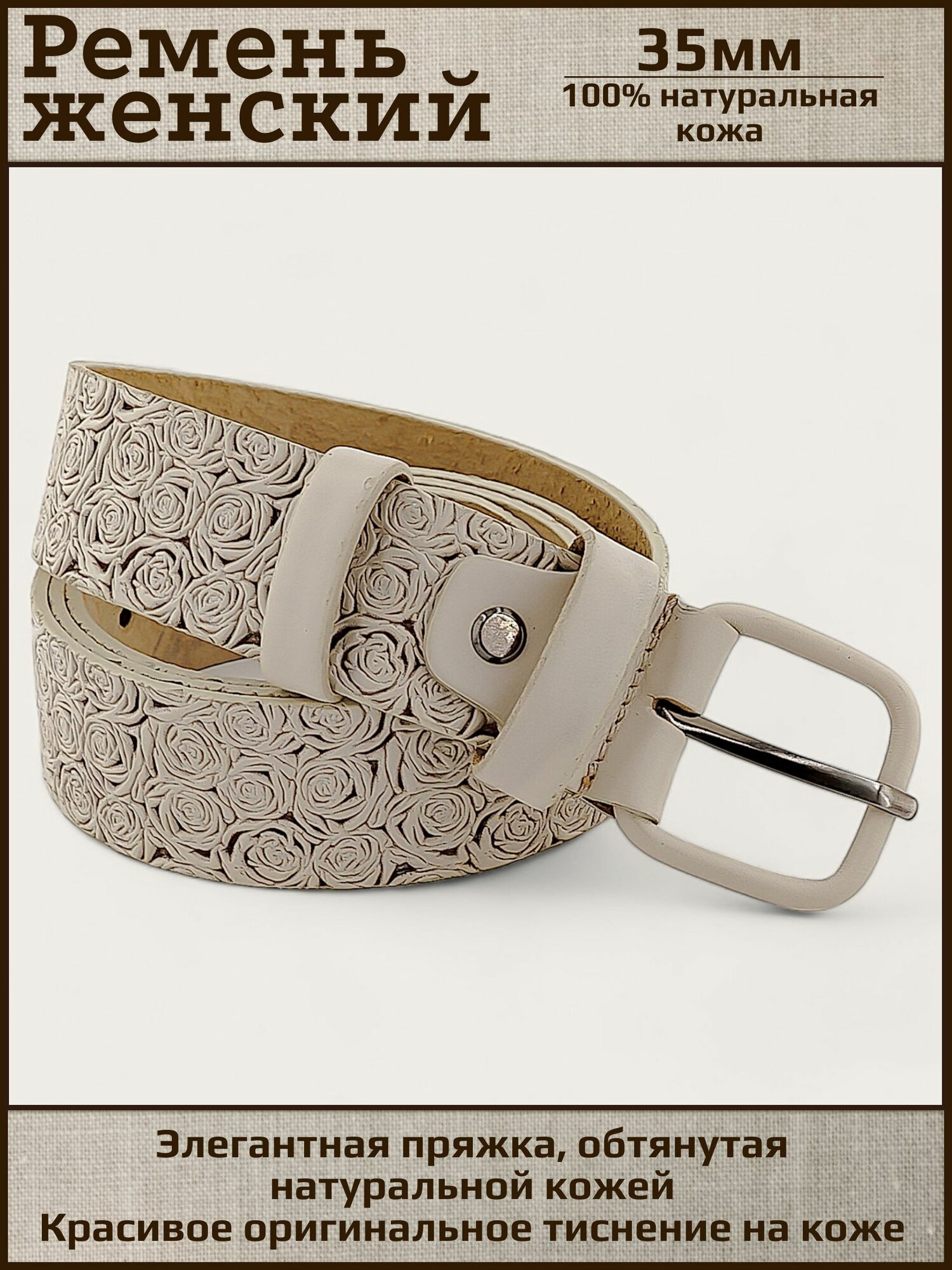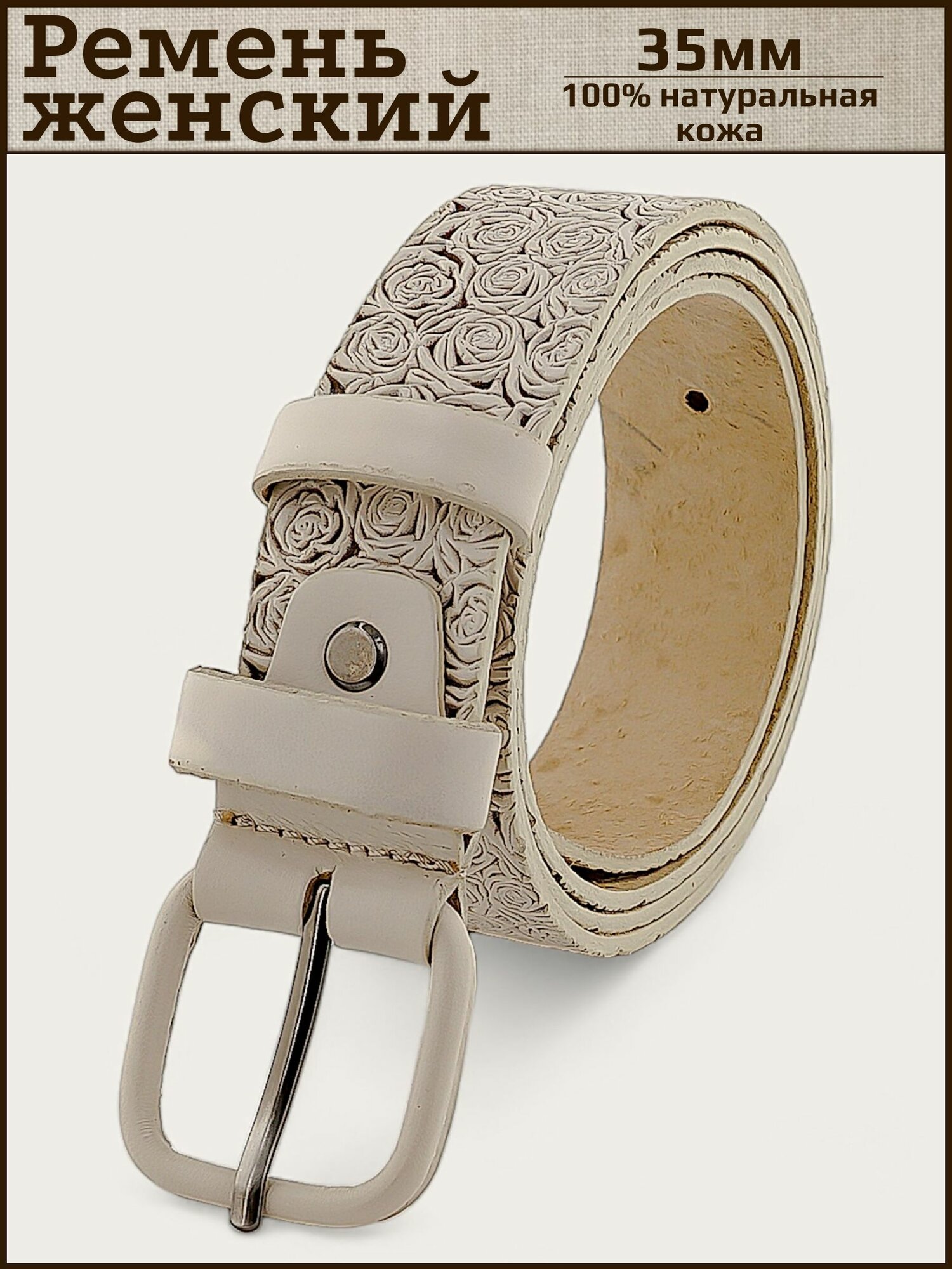 Ремень женский натуральная кожа AKSY BELT, молочный, роза, кожаная пряжка, 95 см