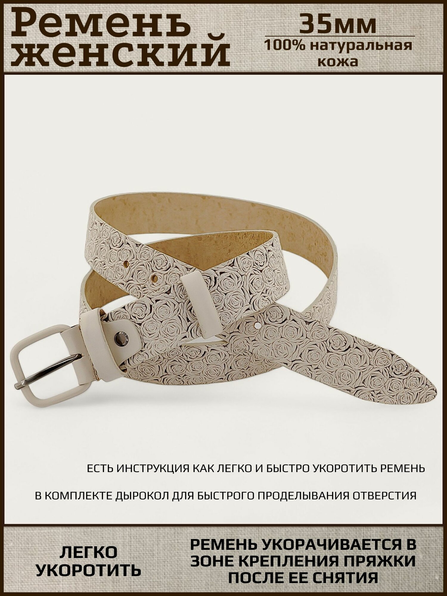 Ремень женский натуральная кожа AKSY BELT, белый, роза, кожаная пряжка, 125 см