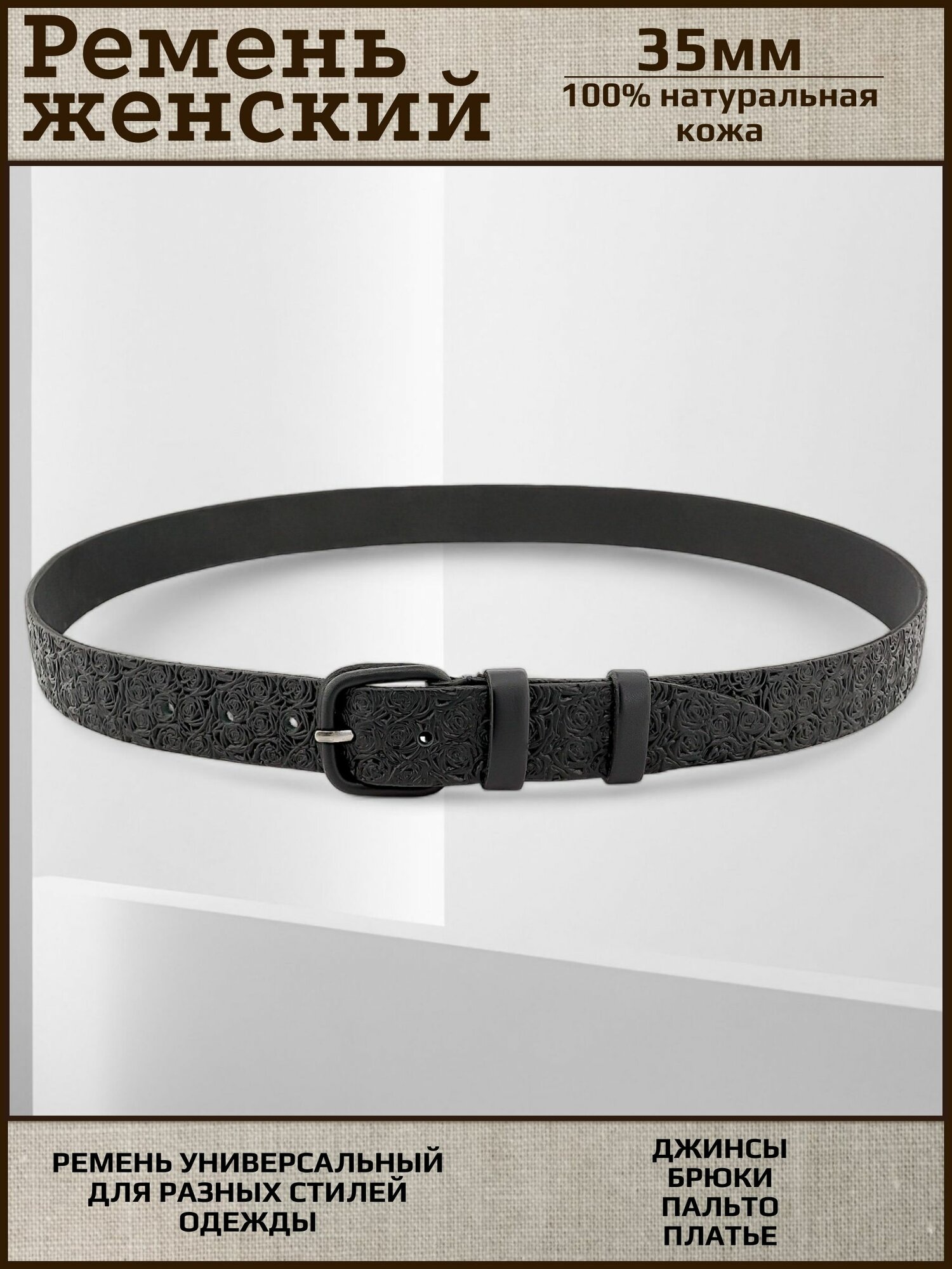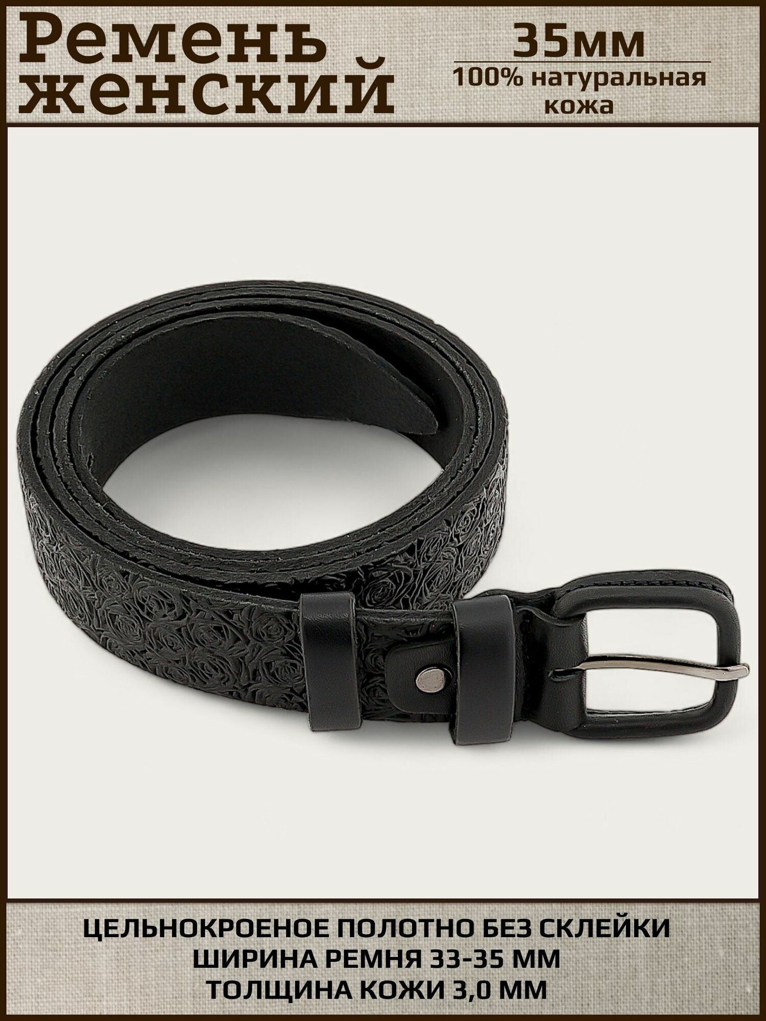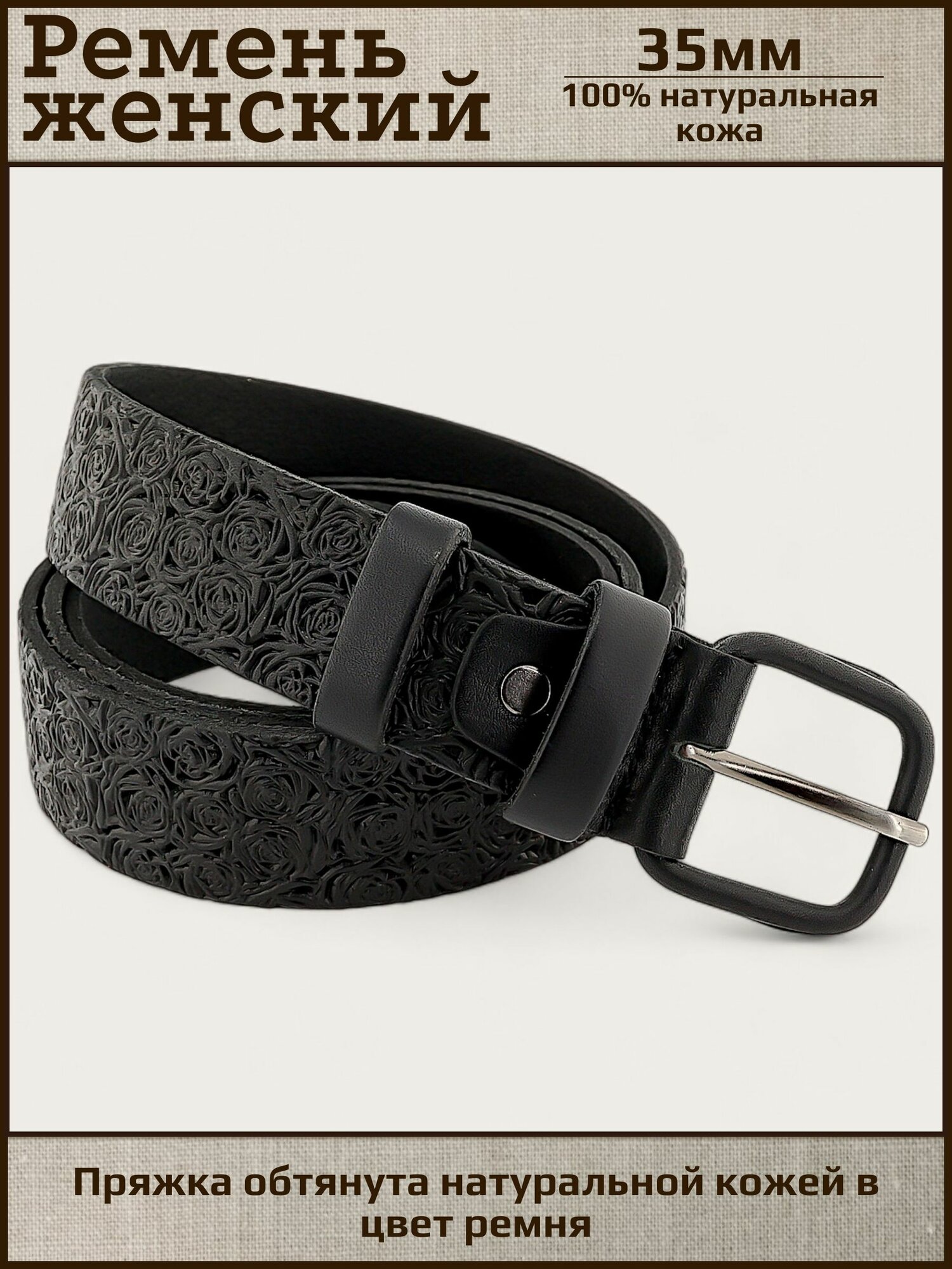 Ремень женский натуральная кожа AKSY BELT, черный, роза, кожаная пряжка, 105 см