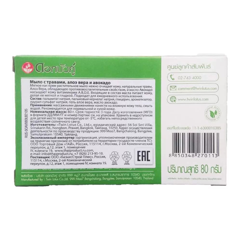 Twin lotus soap aloe vera & avokado oil мыло с алоэ вера и маслом авокадо, 80 гр