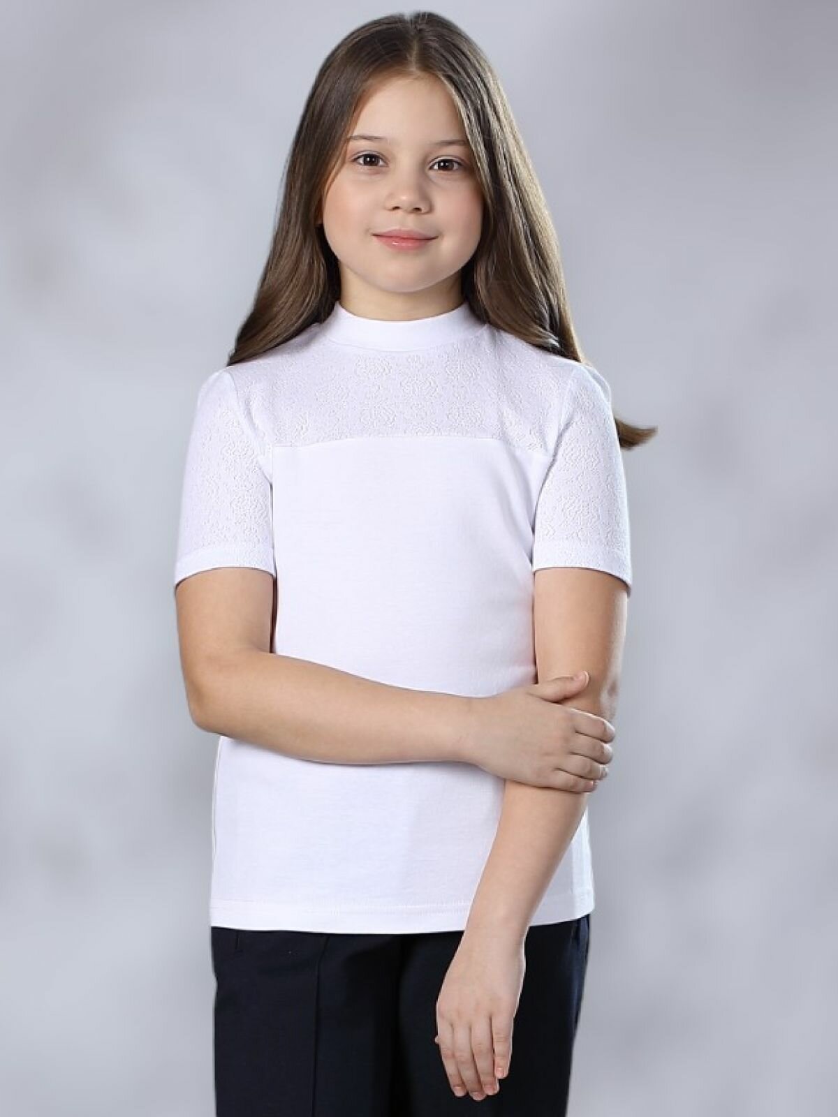 Блузка школьная для девочки, белая, кружевная, трикотажная, 146