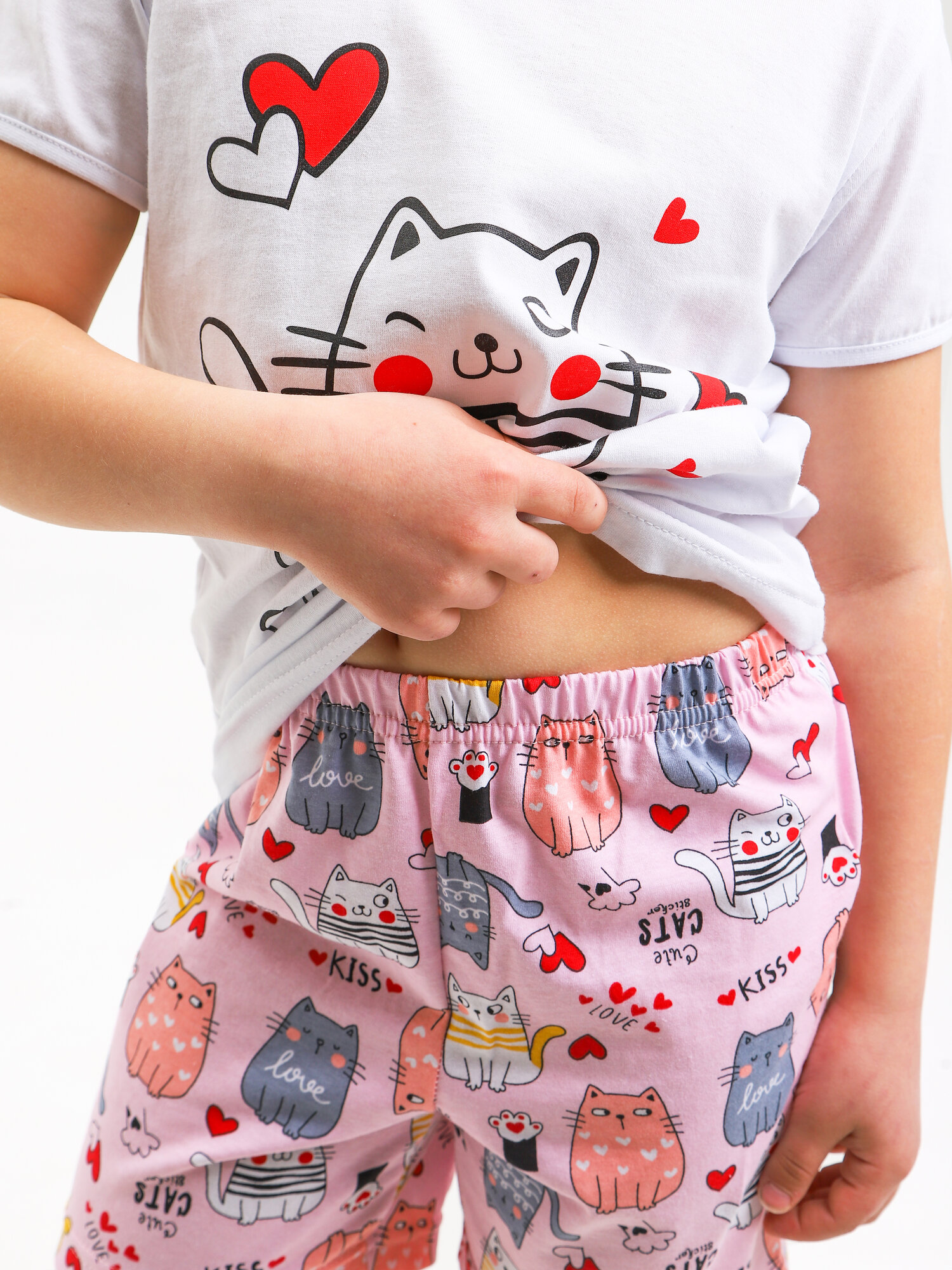 Пижама для девочек, футболка с шортами, Модняшечки, белая/ розовая, мурлыка, размер 116- 64