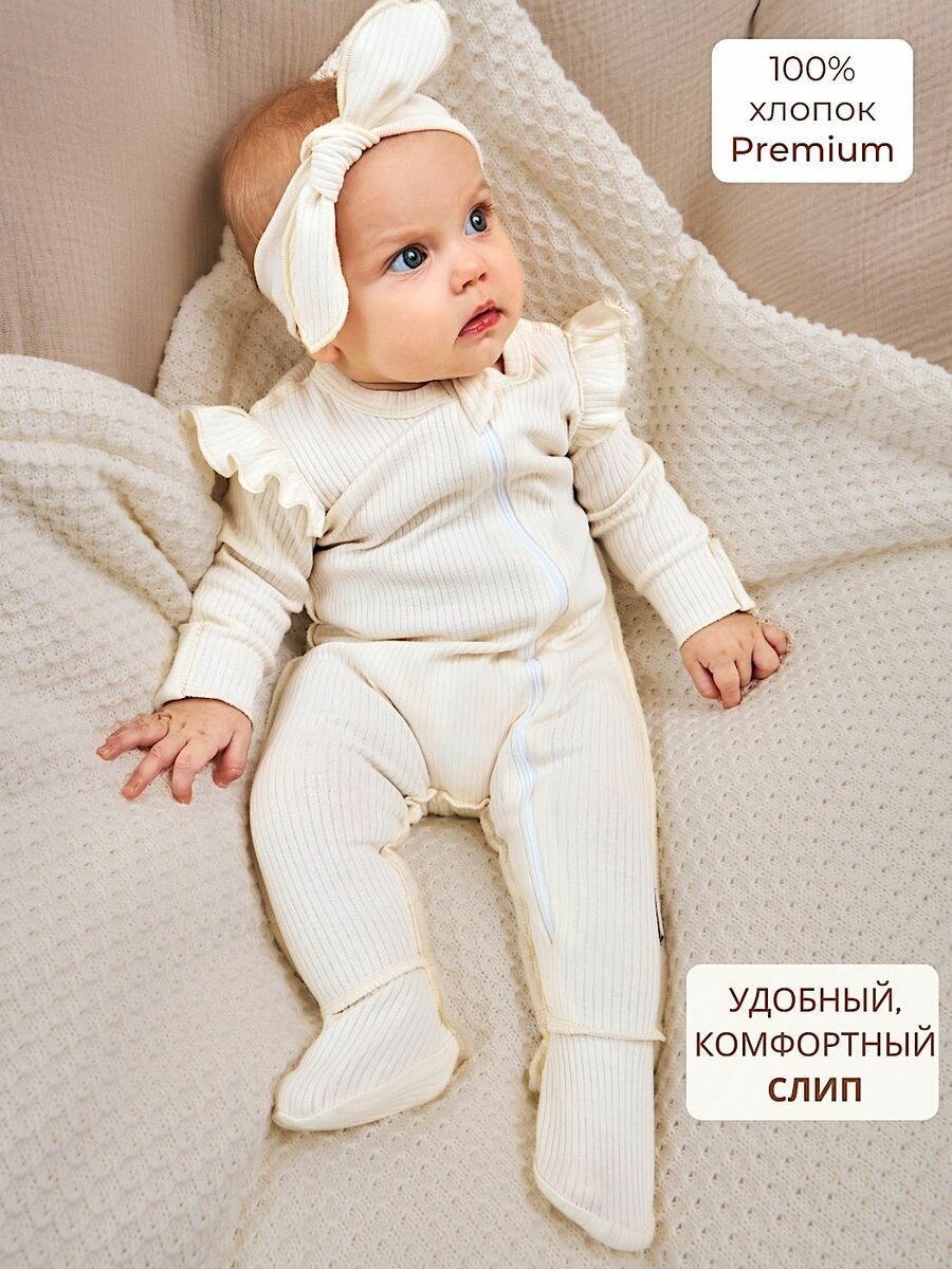 Комбинезон нательный для новорожденных в рубчик Bebo слип лапша с крылышками на молнии с закрытыми ручками и ножками, Экрю, р-р 62