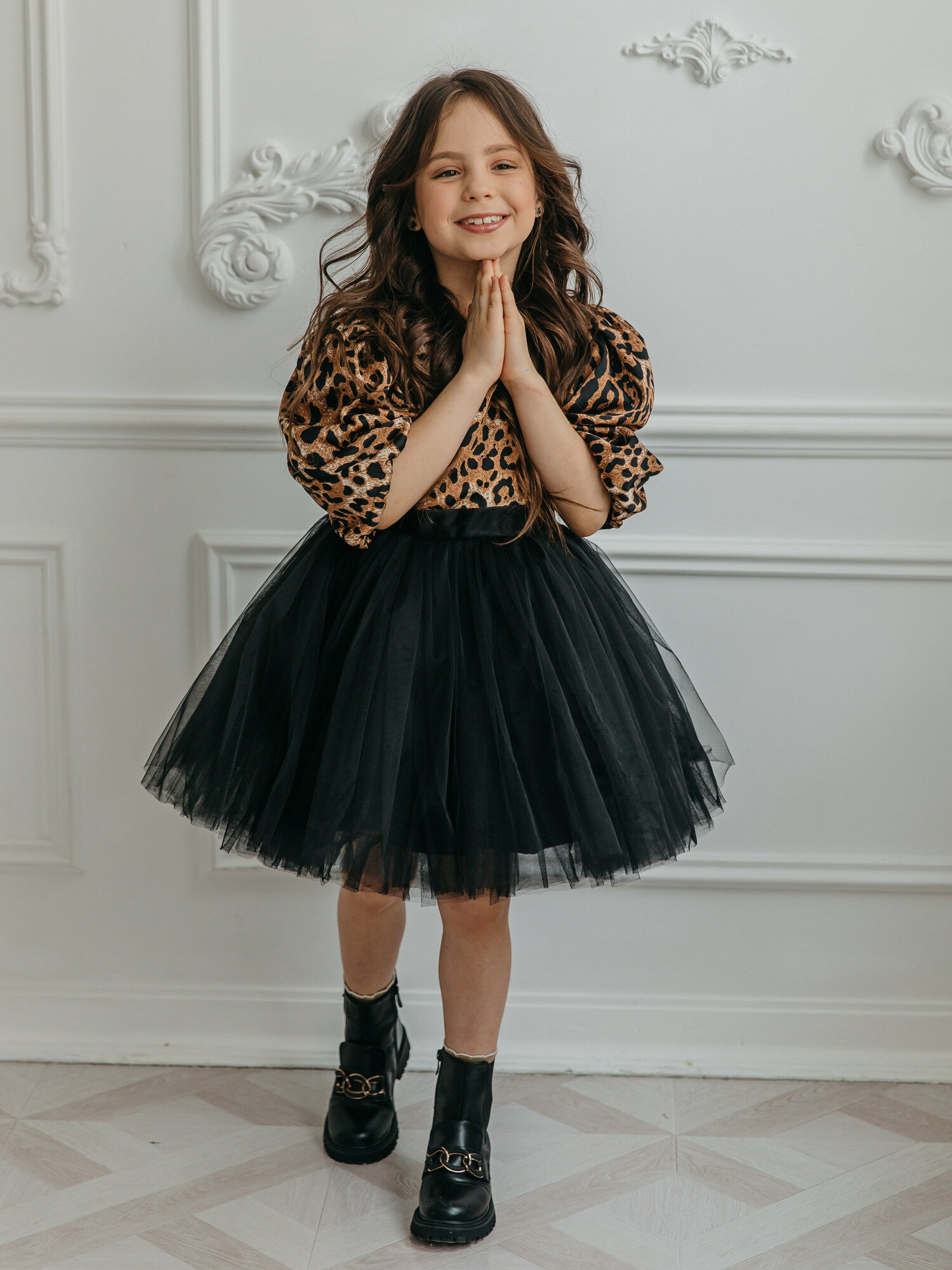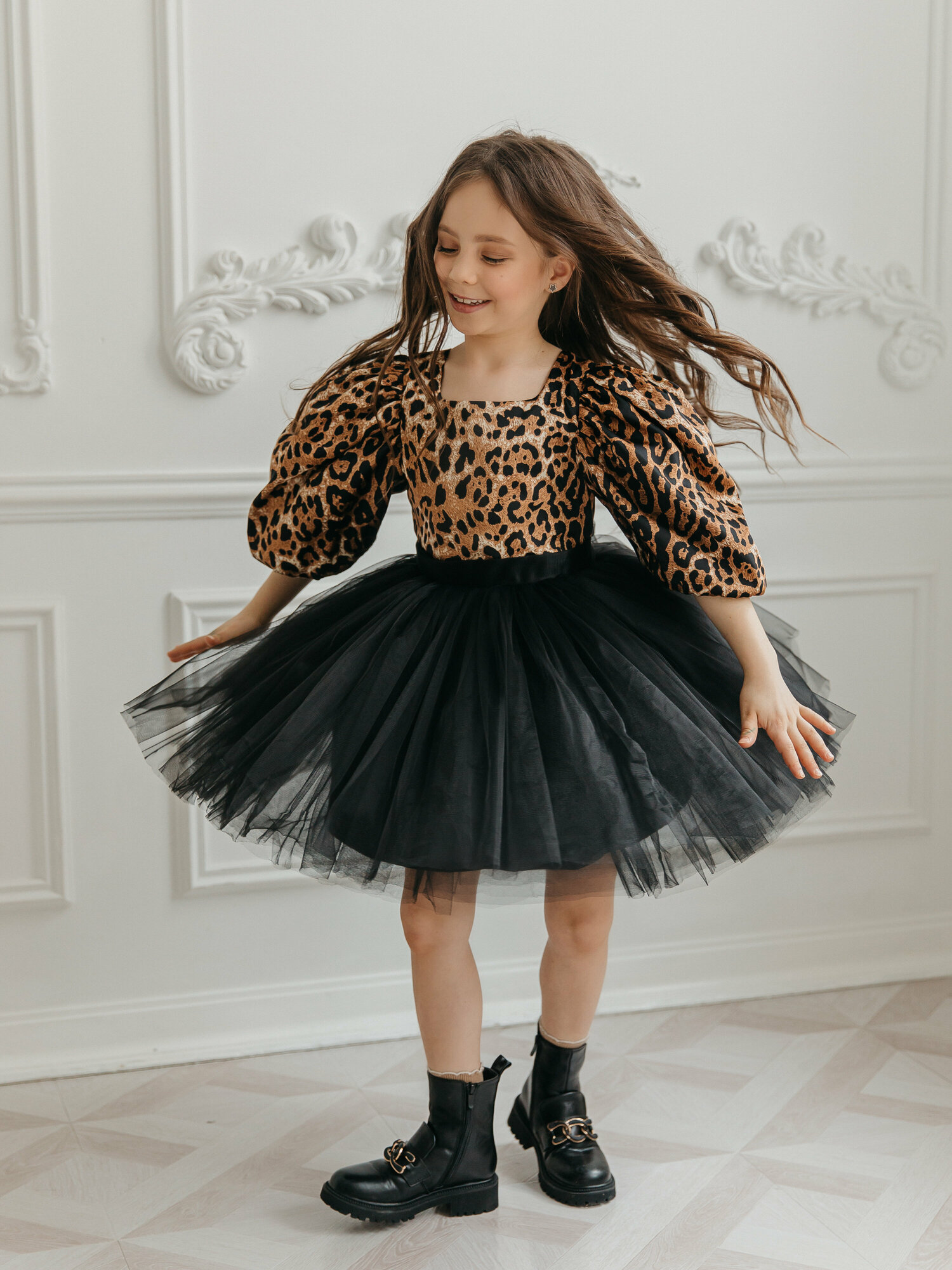 Платье-пачка 122 см черный леопард шелковое нарядное