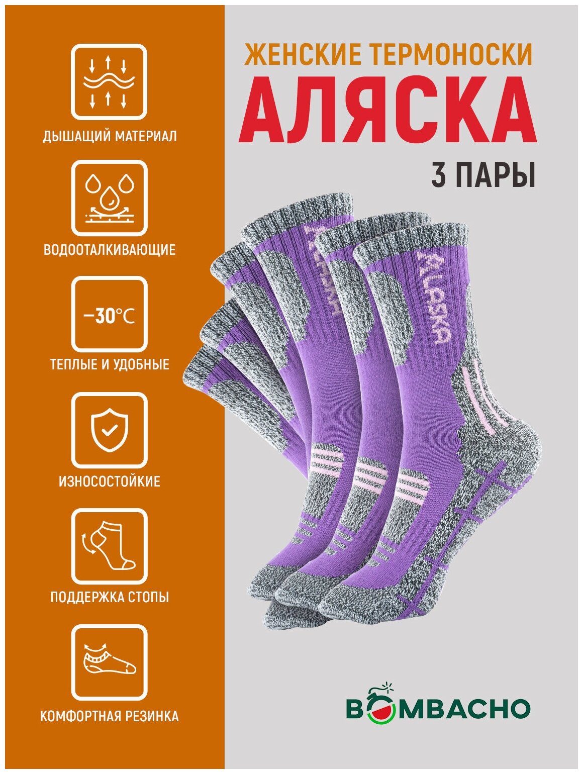 Купить Женские термоноски Bombacho, Аляска, размер 37-41, 3 пары, Фиолетовый