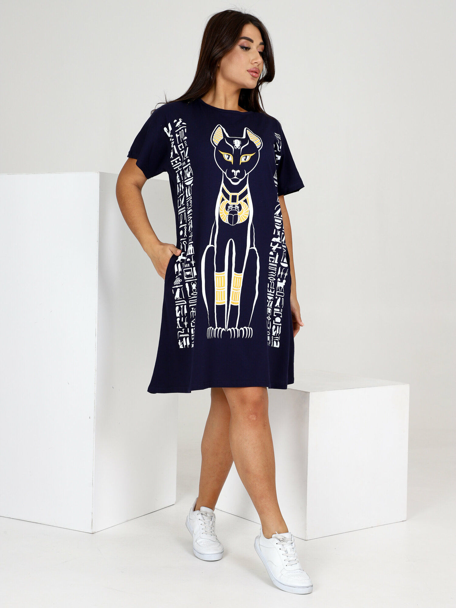 Туника Modalina, 100%, хлопок, 62 размер, темно-синяя, египетская кошка, круглый вырез