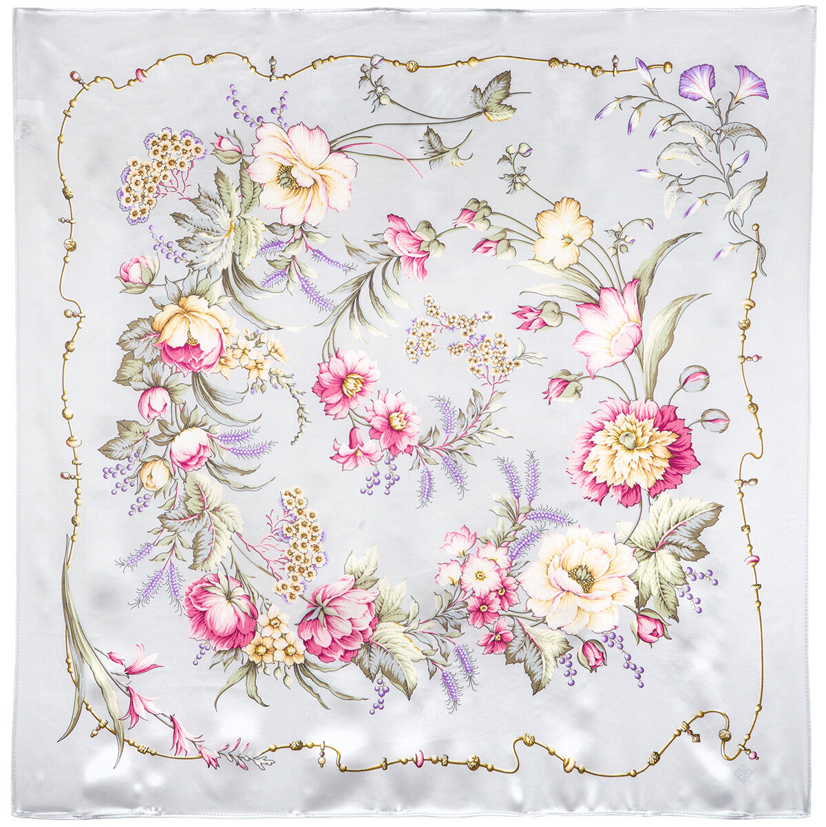 Купить Платок на голову женский шелковый Павловопосадские платки 1455 Белый танец вид 1, белый 89х89 см