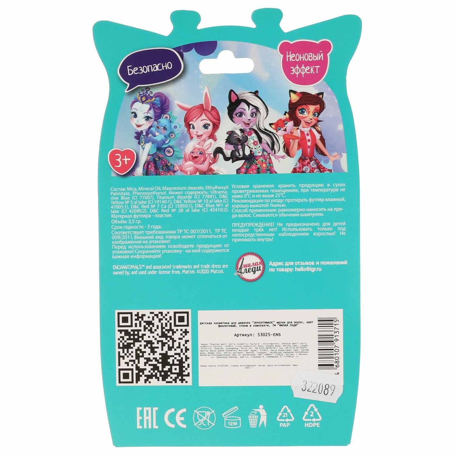 Мелки для волос Милая Леди 53025-ENS Энчантималс, фиолетовые с неоновым эффектом интересное: