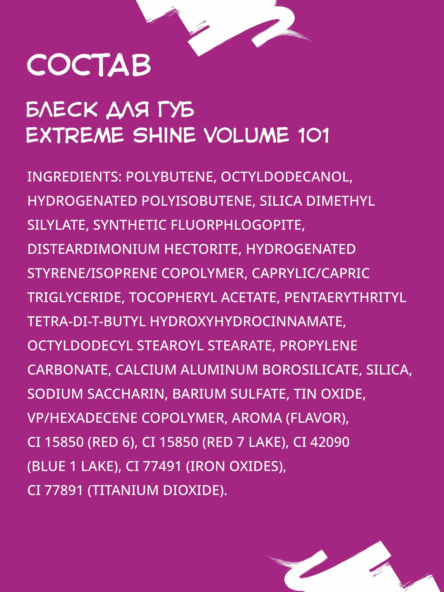 | Состав | POLYBUTENE, OCTYLDODECANOL, AROMA (FLAVOR). |