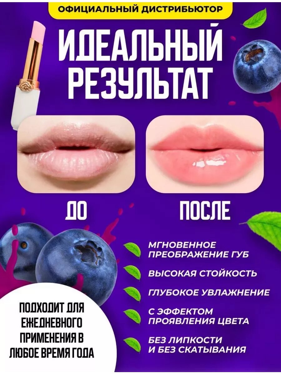 СохранитьПомада тинт для губ с проявляющимся розовым эффектом Голубика / бальзам для губ / тинт для губ интересное: