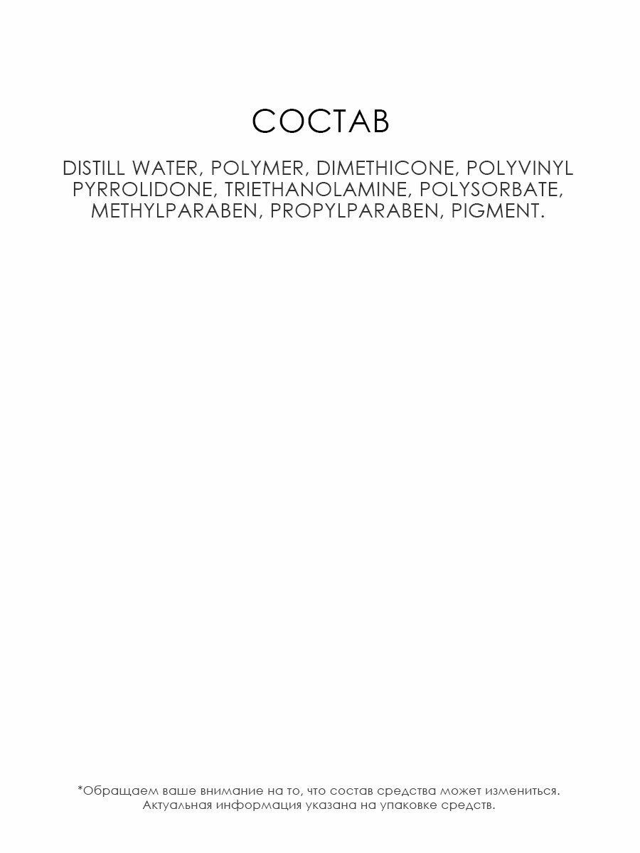 | Состав | aqua/water, propylene glycol, alcohol denat., acrylates copolymer, polyester-5, trilaureth-4phosphate, phenoxyethanol, xanthan gum, sodium dehydroacetate, disodium edta [+/- may contain: ci 77499/iron oxides] |