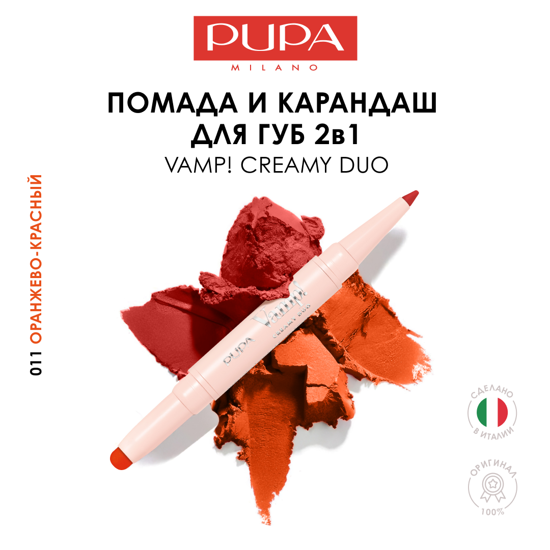 Купить PUPA Помада для губ матовая увлажняющая VAMP! CREAMY DUO №011, оранжево-красный