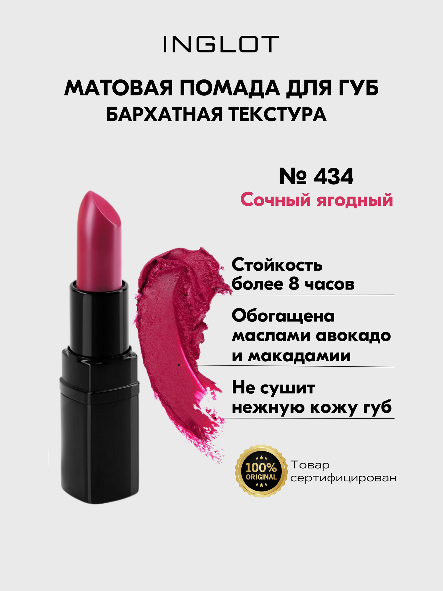 СохранитьПомада стойкая для губ INGLOT матовый финиш, комфортная текстура №434M интересное:
