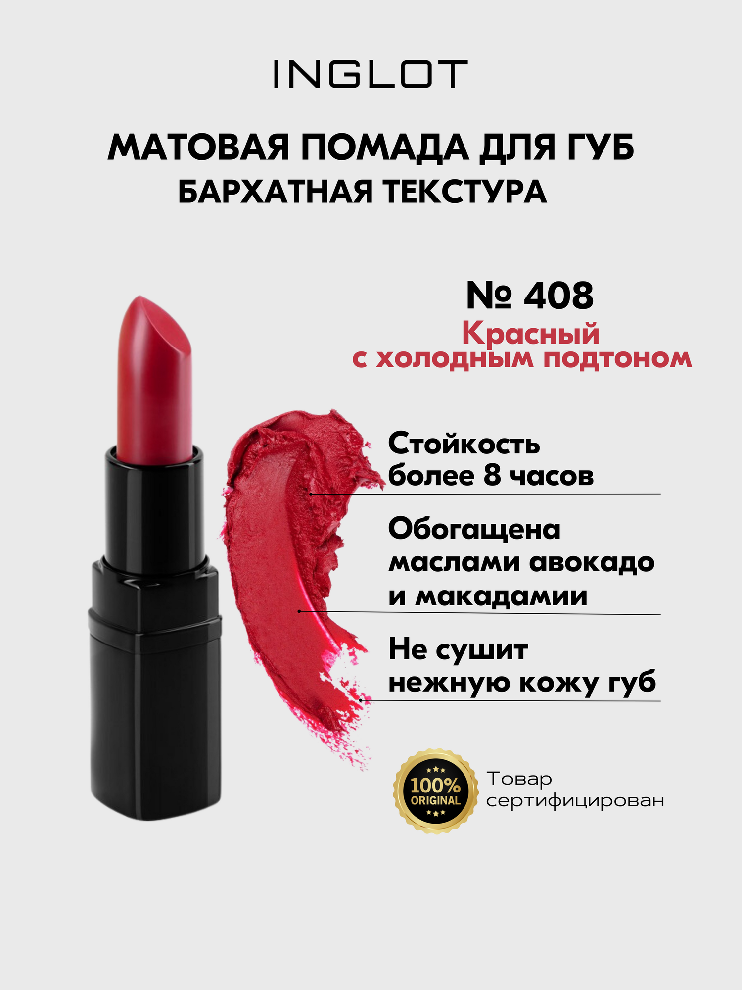 СохранитьПомада стойкая для губ INGLOT матовый финиш, комфортная текстура №408M интересное: