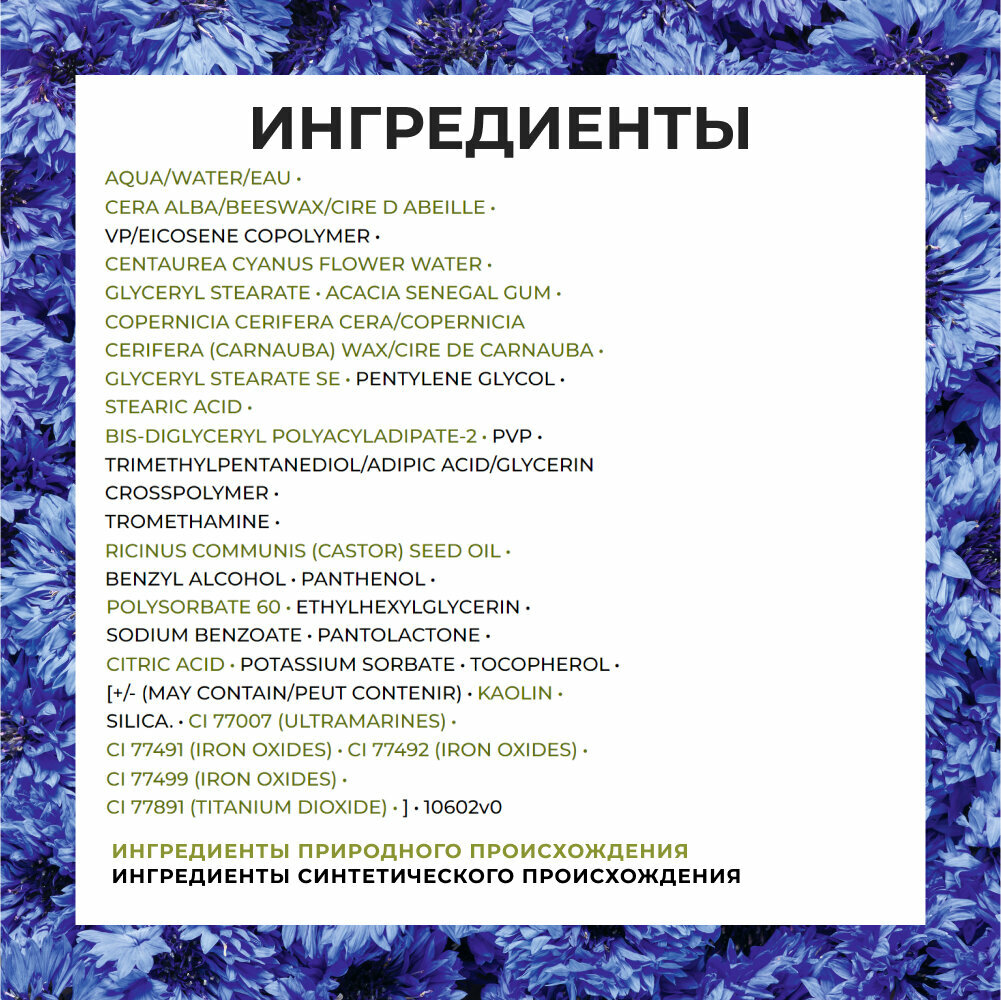 | Состав | aqua/water/eau, cera alba/beeswax/cire d abeille, copernicia cerifera cera/copernicia cerifera (carnauba) wax/cire de carnauba, centaurea cyanus flower water, dipentaerythrityl hexahydroxystearate/hexastearate/hexarosinate, pullulan, polyacrylate-21, peg-40 stearate, acacia senegal gum, pentylene glycol, potassium cetyl phosphate, trimethylpentanediol/adipic acid/glycerin crosspolymervp/eicosene copolymer, glyceryl behenate, glyceryl stearate, ricinus communis (castor) seed oil, sorbitan stearate, benzyl alcohol, tromethamine, panthenol, ethylhexylglycerin, butylene glycol, caprylyl glycol, trideceth-6 phosphate, dipropylene glycol, sodium benzoate, glyceryl caprylate, pantolactone, citric acid, potassium sorbate, tocopherol, ci 77499 (iron oxides), 10474v0 |