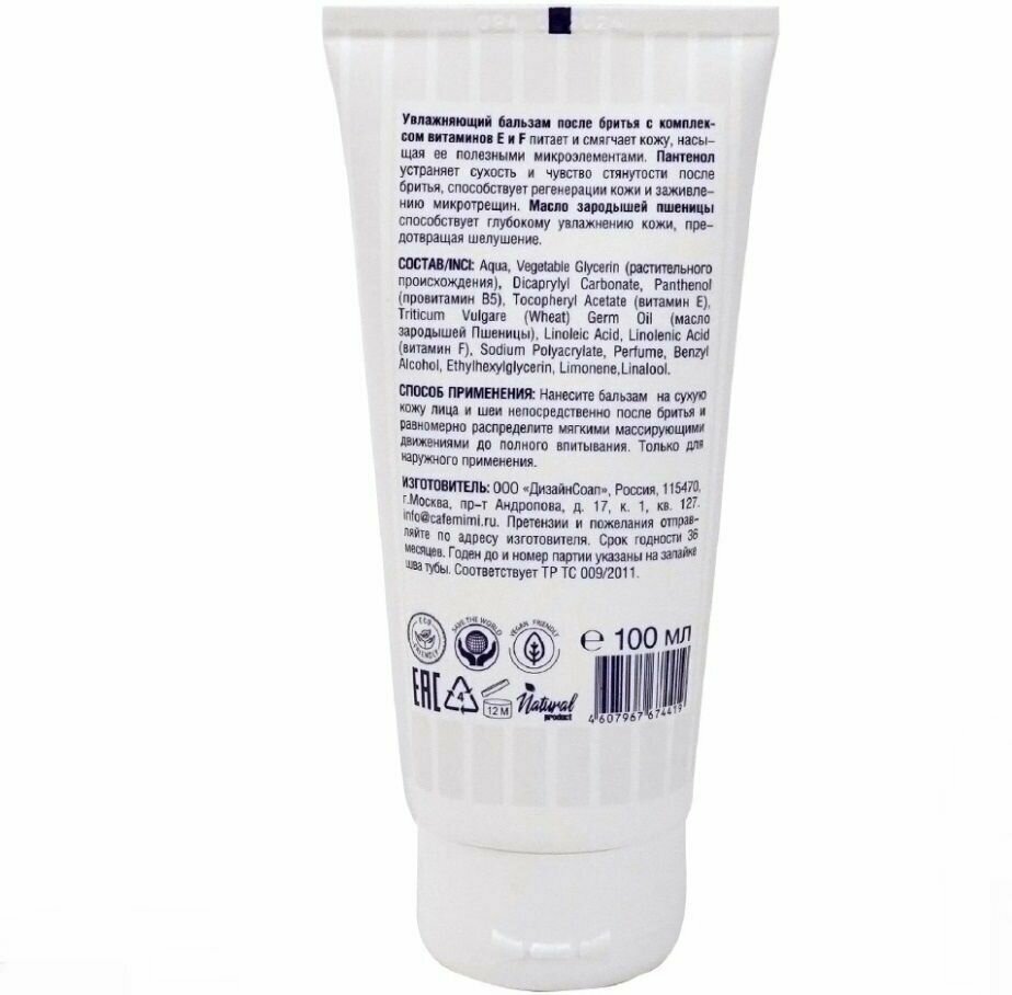 | Дополнительная информация | Увлажняющий бальзам после бритья c комплексом витаминаминов Е и F питает и смягчает кожу, насыщая ее полезными микроэлементами. Пантенол устраняет сухость и чувство стянутости после бритья, способствует регенерации кожи и заживлению микротрещин. Масло зародышей пшеницы способствует глубокому увлажнению кожи, предотвращая шелушение. |