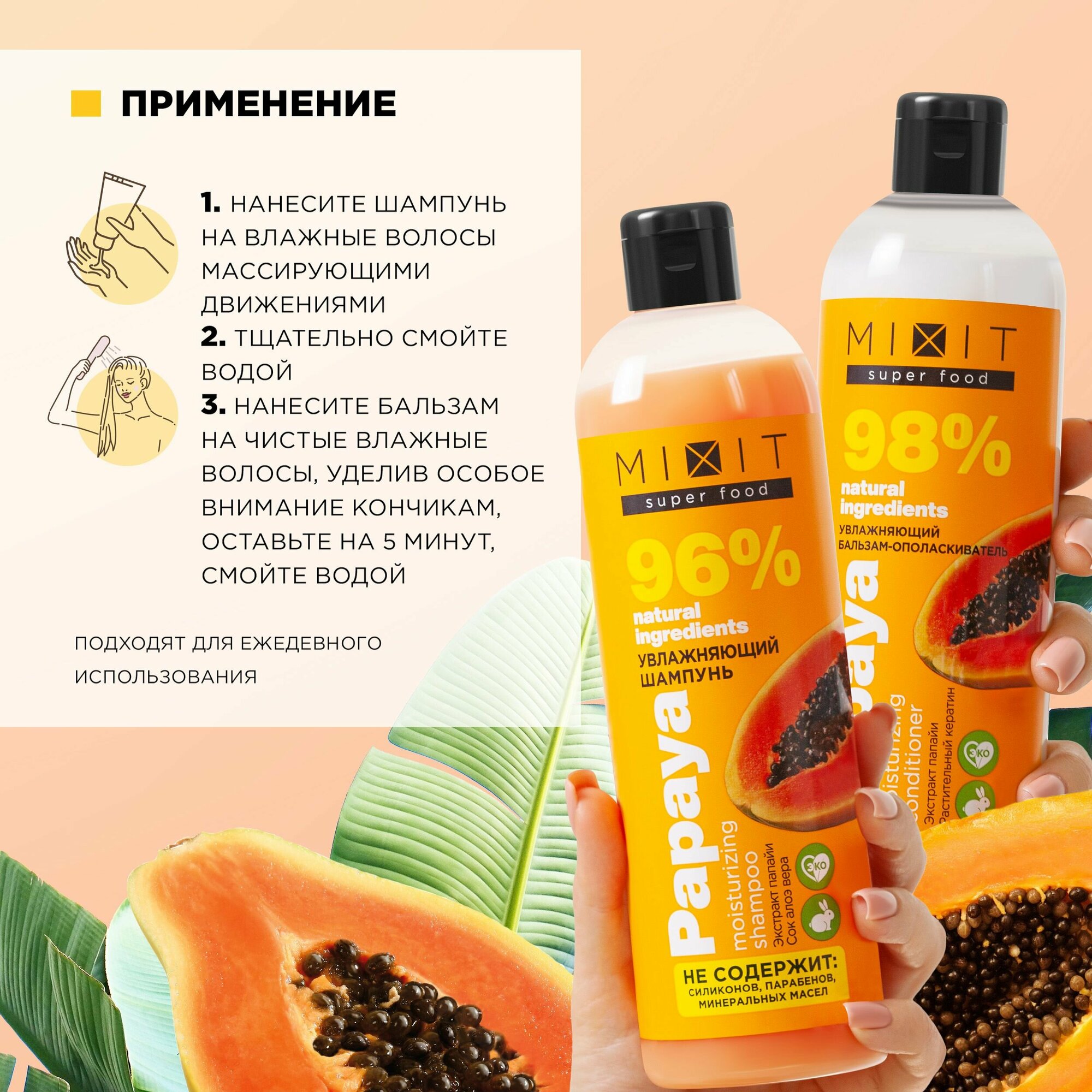 Набор по уходу за волосами: увлажняющий шампунь и бальзам-ополаскиватель с экстрактом папайи SUPER FOOD MixitSF интересное: