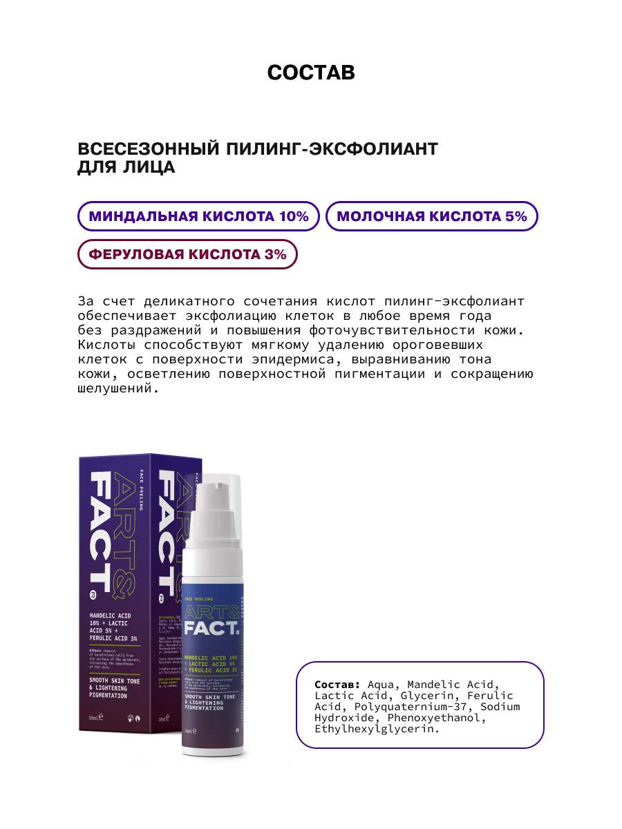 | Состав | 1. Очищающая увлажняющая пенка для умывания лица с комплексом AHA-кислот и с салициловой (BHA-) кислотой: Aqua/Water / disodium laureth sulfosuccinate / Coco-Glucoside / glycerin / Sodium PEG-7 Olive Oil Carboxylate / cocamidopropyl betaine / Dehydroacetic Acid / Benzyl Alcohol / Citric Acid / Chamomilla Recutita Flower Extract / Panax Ginseng Root Extract / Melissa Officinalis Leaf Extract / Cymbopogon Schoenanthus Extract / Salvia Officinalis Leaf Extract / hydrolyzed milk protein / aloe barbadensis leaf extract / Sodium Lactate / Sodium Glycolate / sodium citrate / Sodium Malate / Sodium Tartrate,Lactic Acid / glycolic acid / Citric Acid / malic acid / Tartaric Acid / Urea / Potassium Azeloyl Diglycinate / Sodium PCA / glycine / salicylic acid / arginine / aspartic acid / PCA / alanine / Serine / valine / proline / threonine / isoleucine / histidine / phenylalanine / Cucumis Sativus (Cucumber) Extract / Panthenol. 2. Матирующий и осветляющий тоник с галактомисисом 2% для сужения пор: Aqua / Galactomyces Ferment Filtrate / glycerin / phenoxyethanol / Ethylhexylglycerin / Polysorbate-20 / Allantoin. 3. Анти-акне крем-гель для проблемной кожи с глюконолактоном PHA-кислотой и маслом чайного дерева: Aqua / niacinamide / Glyceryl Stearate SE / Ceteareth-20 / cetearyl alcohol / glycerin / gluconolactone / Melaleuca Alternifolia (Tea Tree) Essential Oil / carbomer / Sodium Hydroxide / phenoxyethanol / BHT 4. Противовоспалительная анти-акне сыворотка для лица с азелаиновой кислотой 10%: Aqua / Azelaic Acid / Propylene Glycol / Polysorbate-20 / niacinamide / Trehalose / Ethylhexylglycerin / phenoxyethanol / allantoin / Panthenol / glycerin / Sodium Hyaluronate / Ammonium Polyacryloyldimethyl Taurate / Melaleuca Alternifolia (Tea Tree) Leaf Extract / Citrus Aurantium Amara Flower Extract / Hamamelis Virginiana (Witch Hazel) Leaf Extract / Aloe Barbadensis (Aloe Vera) Leaf Juice Extract / Rosmarinus Officinalis Water / Thymus Serpyllum Extract / Eucalyptus Globulus Leaf Oil. 5. Всесезонный пилинг-эксфолиант для лица с миндальной кислотой 10% / молочной кислотой 5% и феруловой кислотой: Aqua / Mandelic acid / lactic acid / glycerin / Ferulic Acid / Polyquaternium-37 / Sodium Hydroxide / phenoxyethanol / Ethylhexylglycerin 6. Cолнцезащитная эмульсия SPF 40+ для лица и области вокруг глаз с химическими фильтрами: Aqua / Propyl Нeptyl Caprylate / Tris-biphenyl Triazine / Decyl Glucoside / butylene glycol / Disodium Phosphate / Xanthan Gum / glycerin / Bis-Benzotriazolyl Tetramethylbutylphenol / Decyl Glucoside / Propylene Glycol / Coco-Caprylate / cetearyl alcohol / Diethylamino Hydroxybenzoyl Hexyl Benzoate / Amaranth Extract / Cocoa Extract / GREEN TEA EXTRACT / Black Tea Extract / Spinach Extract / Ethylhexyl Triazone / Ethylhexyloxyphenol Methoxyphenyl Triazine / ethylhexyl methoxycinnamate / Benzyl Alcohol / Benzoic Acid / Sorbic Acid / Sodium Stearoyl Glutamate. |