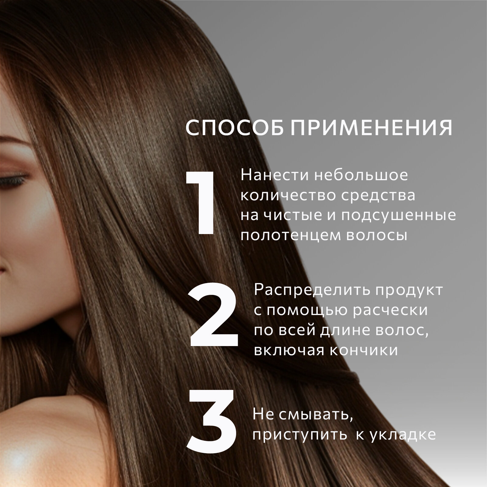 | Способ применения | Нанести небольшое количество средства на чистые, подсушенные полотенцем волосы. Равномерно распределить по длине и кончикам волос с помощью расчески, не смывать. |