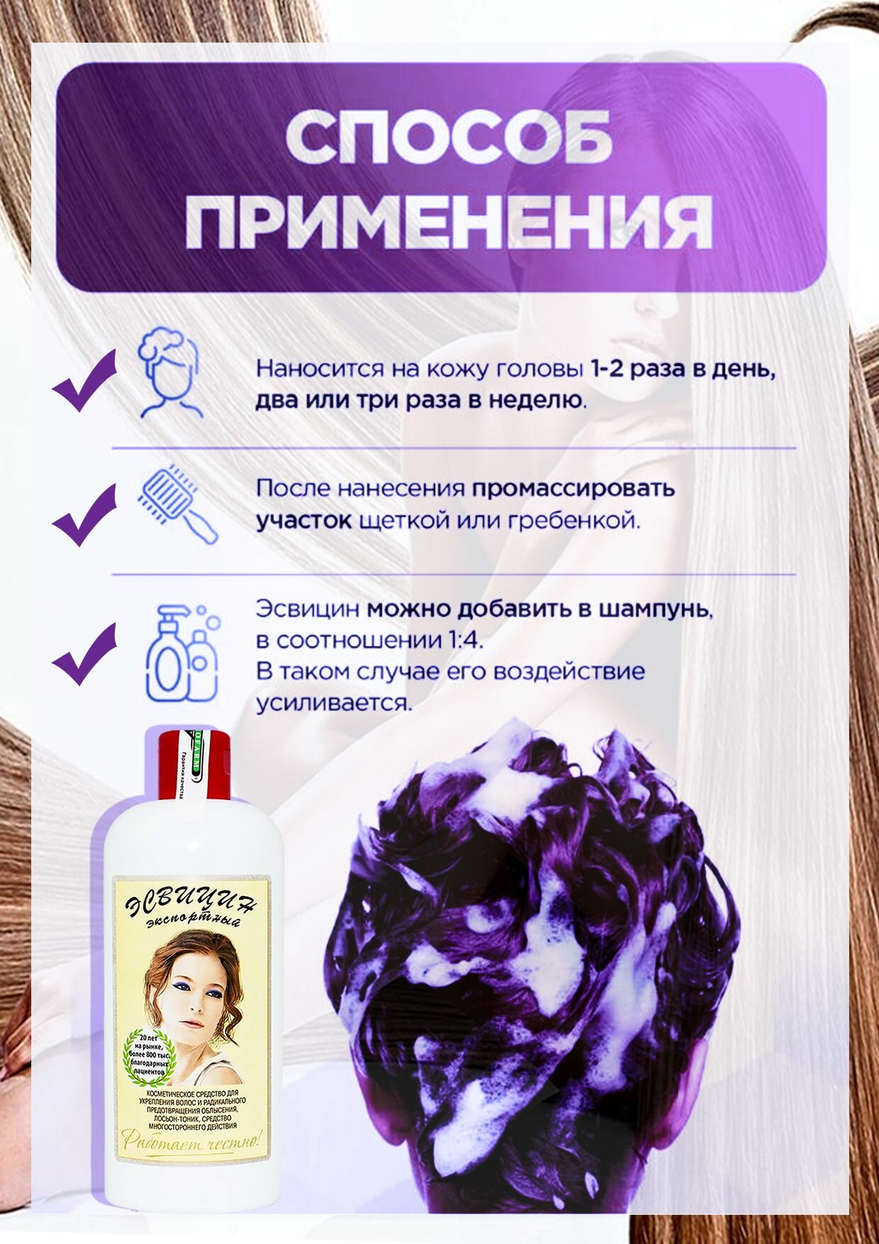 | Способ применения | При мытье волос добавлять 10-20% средства в шампунь, |