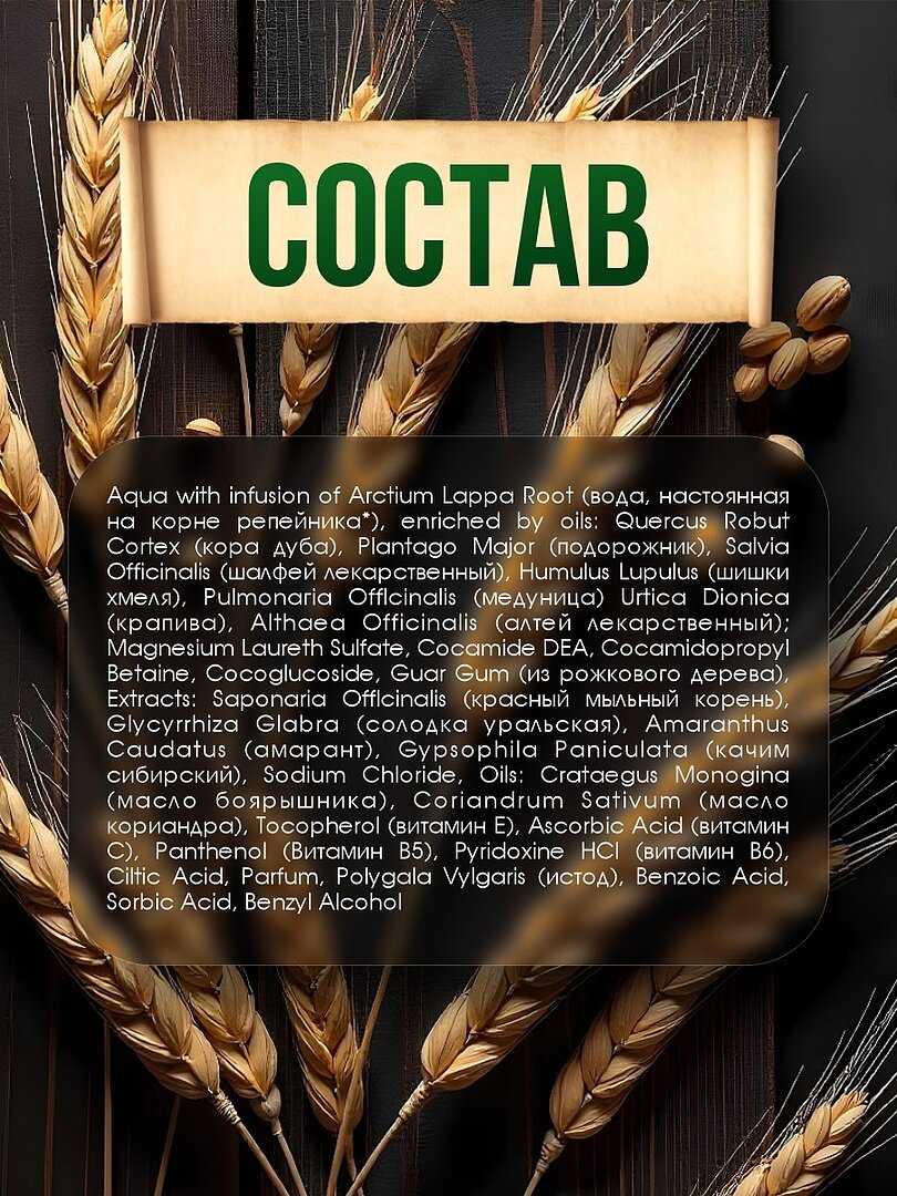 | Состав | aqua with infusion of triticum vulgare wheat bran (вода, настоянная на пшеничных отрубях), enriched by oils: arctium lappa (масло репейника), artemisia absinthium (масло полыни), crateegos monogina (масло боярышника), меlіlotus officnalis (масло донника), extracts: secale cereale (рожь), tussilago farfara (мать-и-мачеха), thymus serpillum (богородская трава), polygonum fagopyrum (гречиха), tilia соrdata (липовый цвет); magnesium laureth sulfate, cocamide dea, cocamidopropyl betaine, cocoglucoside, guar gum (из рожкового дерева), extracts: saponaria offlcinalis (красный мыльный корень), glycyrrhiza glabra (солодка уральская),amaranthus caudatus (амарант), gypsophila paniculata (качим сибирский),sodium chloride, oils: thymus vulgaris (масло чабреца), artemisia absinthium (масло полыни), propolis, tocopherol (витамин е),ascorbic acid (витамин с), pyridoxine hci (витамин в6), hydrolyzed wheate protein (протеины пшеницы),citric acid, parfum, polygala vylgaris (истод), benzoic acid,sorbic acid, benzyl alcohol |