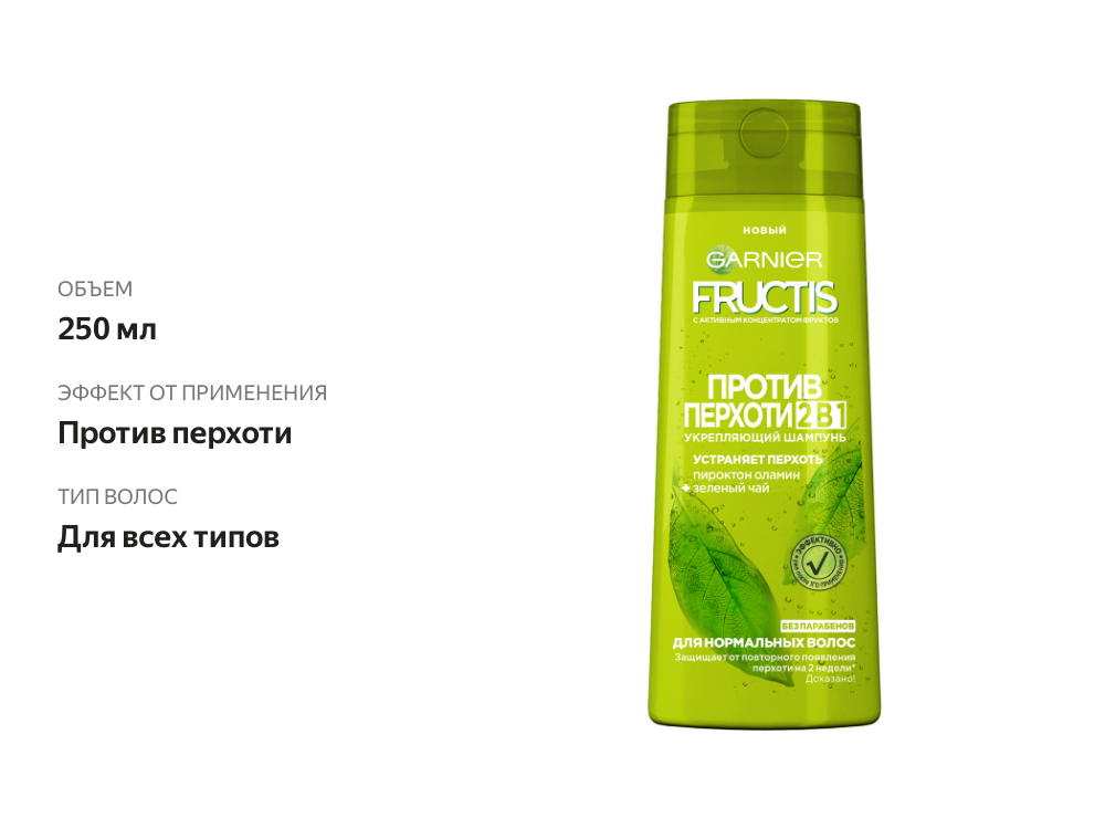 Купить Garnier Fructis Шампунь для волос "Фруктис, Против перхоти 2в1", для всех типов волос, 250 мл с зеленым чаем и пироктон оламином