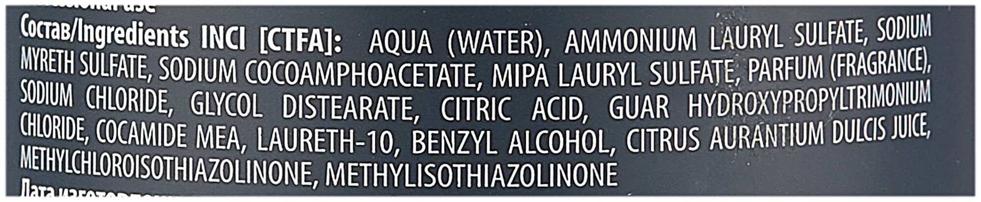 | Состав | вода, лимонная кислота, пропиленгликоль, метилизотиазолинон, натрия хлорид, бензиловый спирт, натрия кокоамфоацетат, цитрусовых экстракт, метилхлоризотиазолинон, кокамид мэа, гликоль дистеарат |