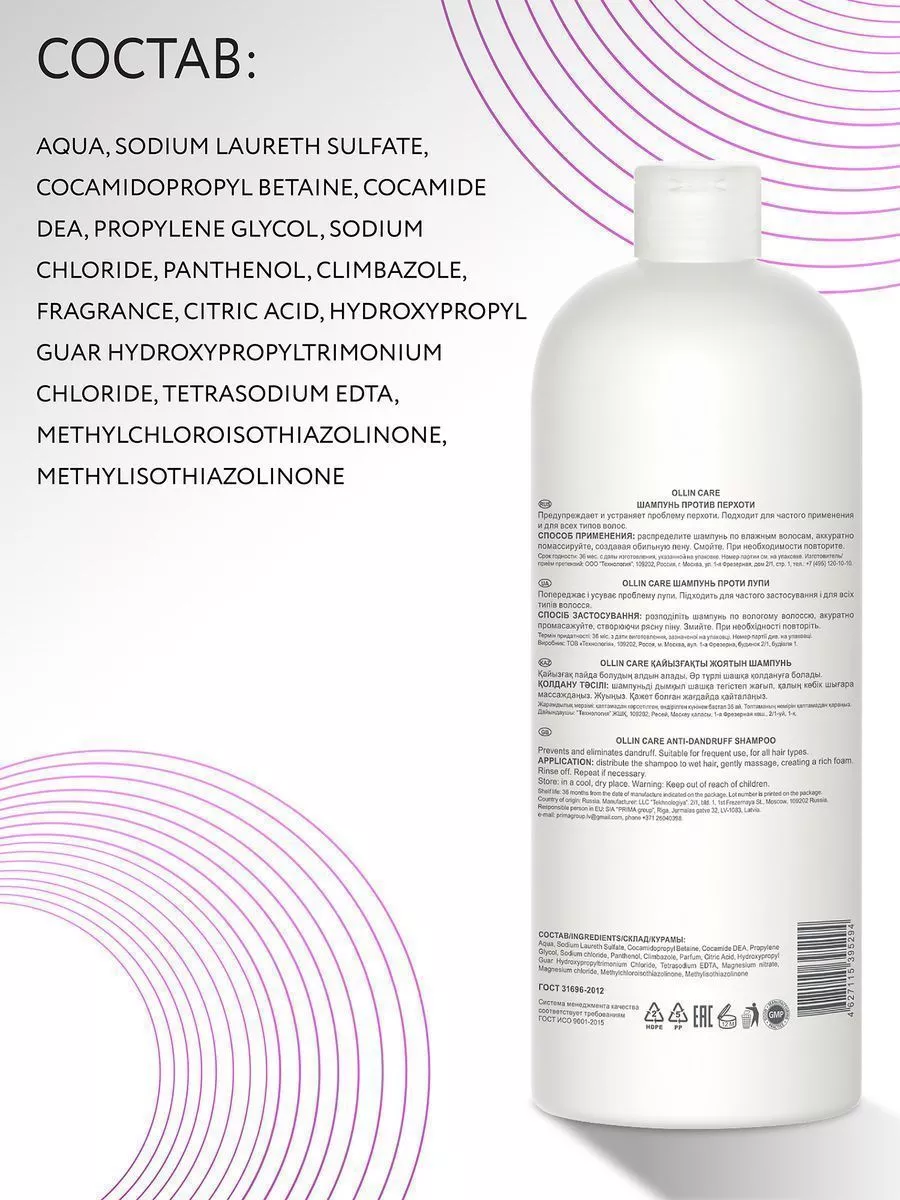 | Состав | aqua, sodium laureth sulfate, cocamidopropyl betaine, cocamide dea, propylene glycol, sodium chloride, panthenol, climbazole, parfum, citric acid, hydroxypropyl guar hydroxypropyltrimonium chloride, tetrasodium edta, magnesium nitrate, magnesium chloride, methylchloroisothiazolinone, methylisothiazolinone |
