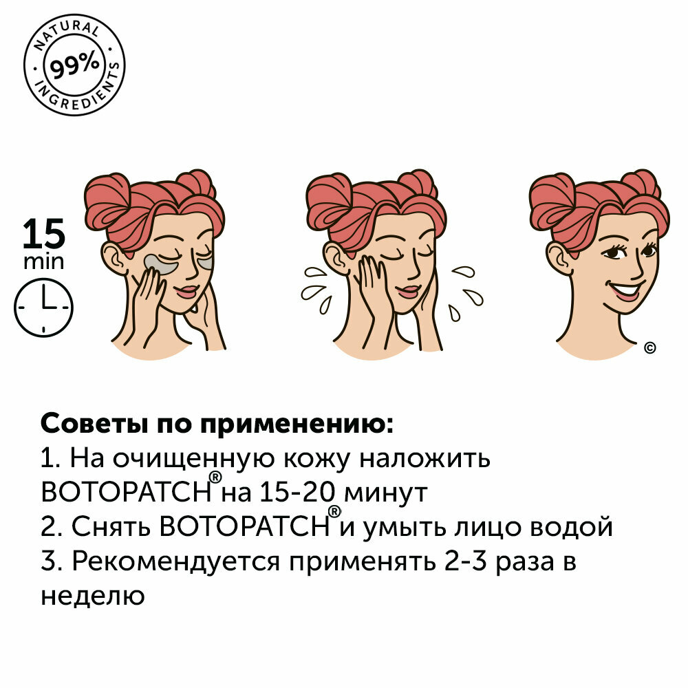 | Способ применения | наложите патчи на очищенную кожу на 20-30 минут. После снятия патчи сразу же можно использовать на других зонах. Затем умойте лицо водой. Рекомендуется применять 2-3 раза в неделю |